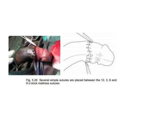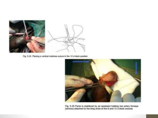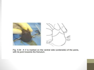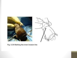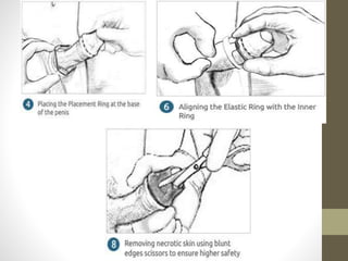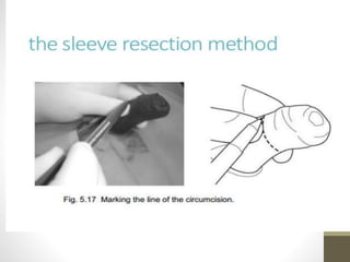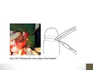 This document provides information on voluntary medical male circumcision (VMMC). It defines circumcision as the surgical removal of the foreskin and discusses its medical and cultural indications. Contraindications and pre-operative preparation are outlined. The dorsal slit method of circumcision is described along with post-operative care and potential complications. Non-surgical devices for circumcision like the Shang ring and Prepex are also mentioned.