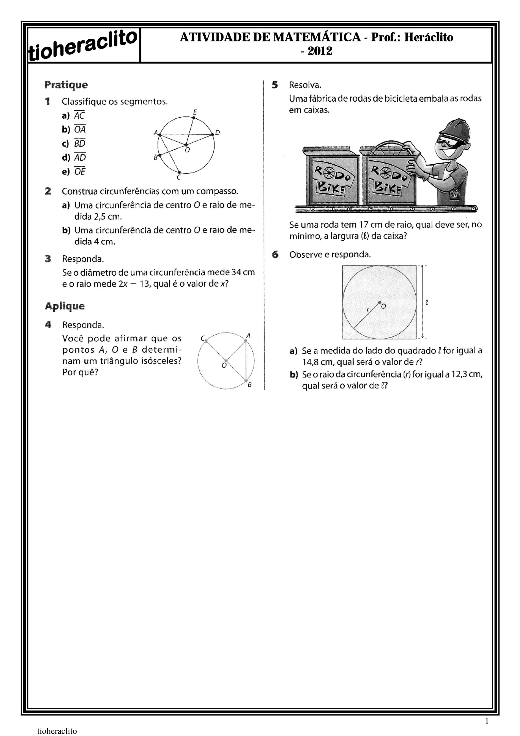 Lista de exercícios abordando as definições iniciais sobre círculos e circunferências, bem como as posições relativas de ponto, retas e circunferências.