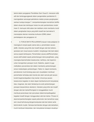 Bahan panduan ini bertujuan memberi panduan kepada guru dalam meningkatkan daya kreativiti murid melalui aktiviti eksplorasi media dan teknik seni. Ia merangkumi tajuk yang menekankan penerokaan, proses penghasilan karya seni, pemahaman seni secara menyeluruh, dan aspek kritikan untuk membentuk generasi Malaysia yang celik budaya dan seni.