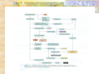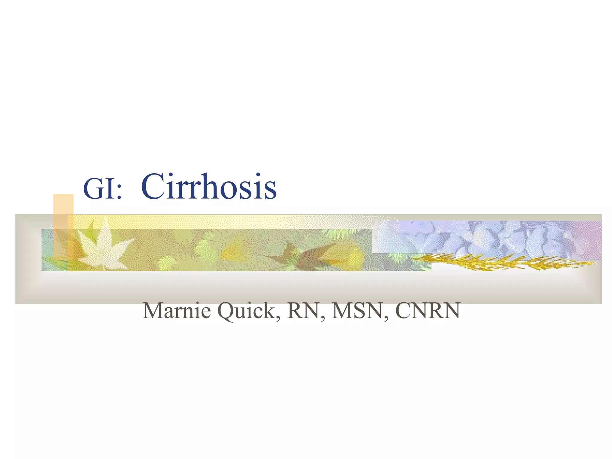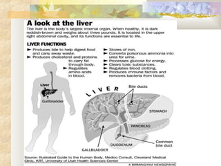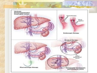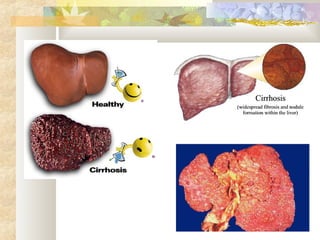 This document provides information about cirrhosis of the liver including its causes, stages of progression, complications, treatment, and nursing care considerations. Cirrhosis is the end stage of chronic liver disease where liver tissue is replaced by scar tissue, disrupting blood flow and metabolic functions. Common causes include alcoholism and hepatitis. Complications include portal hypertension, esophageal varices, ascites, and hepatic encephalopathy. Treatment focuses on managing complications, medications to reduce bleeding risk and ammonia levels, dietary changes, and potentially liver transplantation. Nursing care involves monitoring for symptoms, providing education, managing fluid balance and medications, and preventing complications.