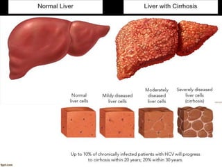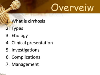 Cirrhosis is a chronic liver disease characterized by fibrosis and loss of liver function, with types including micronodular and macronodular cirrhosis, often due to factors like alcohol, viral infections, and metabolic disorders. Clinical presentation varies and includes non-specific symptoms like malaise and jaundice, alongside distinct physical signs and complications. Management encompasses supportive care, addressing specific etiologies, and treatment of complications, with prognosis evaluated via the Child-Pugh scoring system.