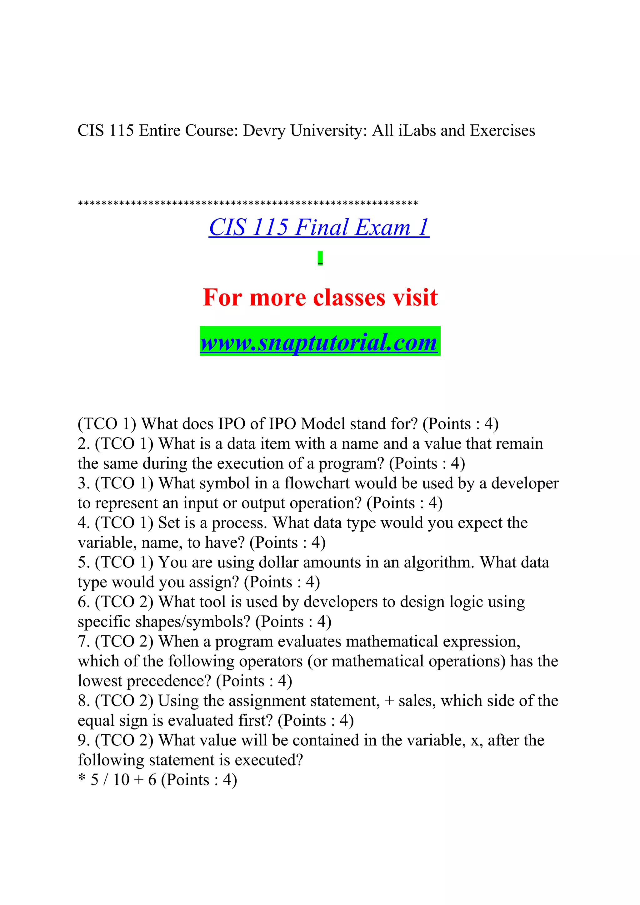 This document contains sample exam questions and answers for CIS 115 at Devry University. It includes two practice final exams that cover topics like flowcharts, pseudocode, variables, selection structures, repetition structures, arrays, files, and developing algorithms. The questions test understanding of concepts like the IPO model, data types, operators, control flow, loops, arrays, records, files, and menu-driven programs. Sample code and partial pseudocode are also provided for practice problems.