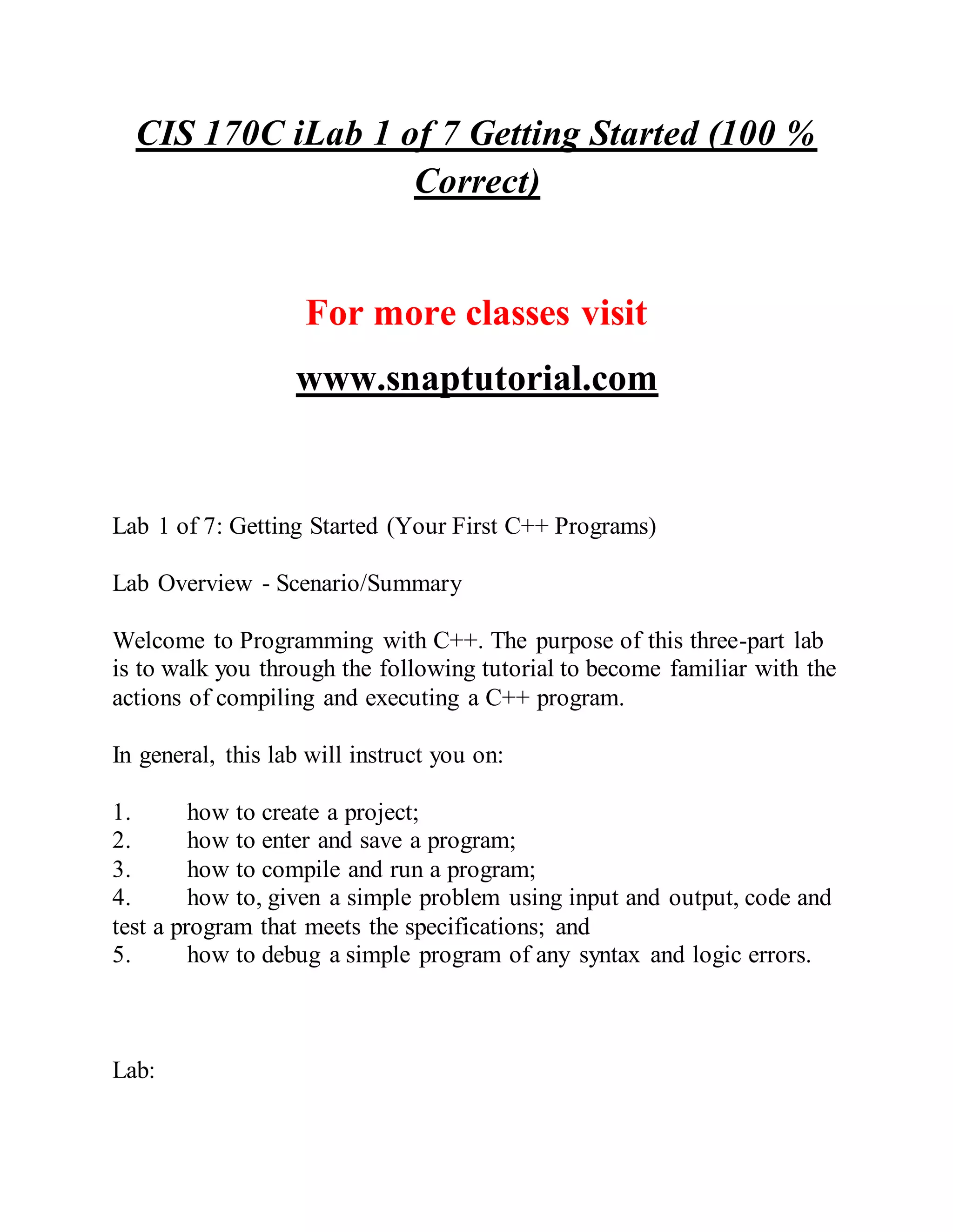 This document describes a lab assignment to create a C++ program that scores divers. The program will: