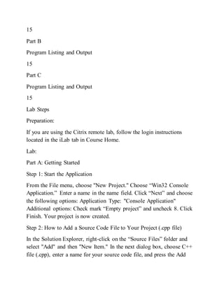 The document outlines a C++ programming lab that consists of multiple parts aimed at teaching students how to compile, execute, and debug C++ programs. It includes step-by-step instructions for creating projects, writing code, capturing outputs, and validating inputs across various scenarios including ticket calculations and diver scoring. Each part also requires students to document their work in a Word file for submission.