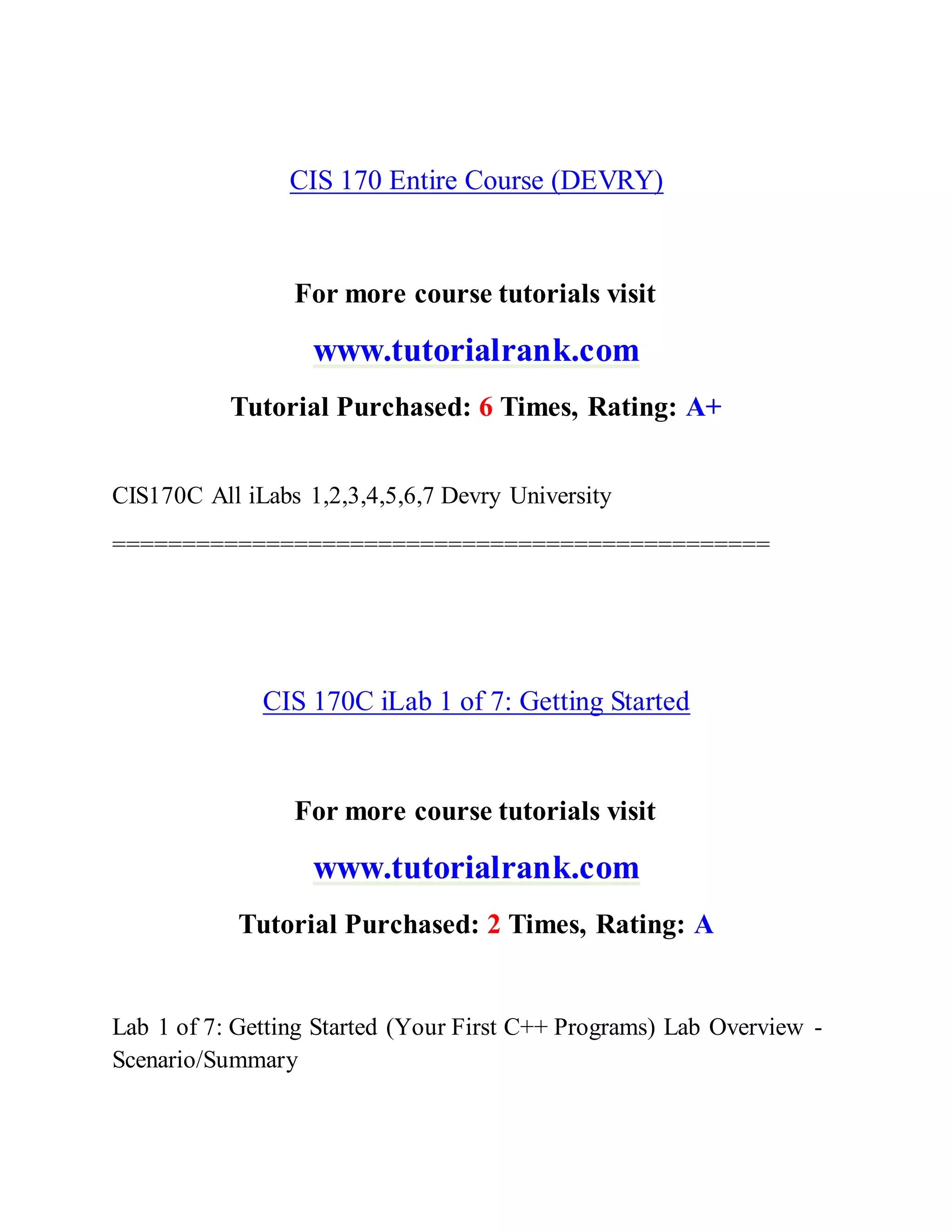 The document outlines the iLab assignments for the CIS 170 course at Devry University, focusing on C++ programming skills through various labs. It covers tasks from getting started with basic C++ programs to more complex projects involving decision-making, calculations, and looping structures. Each lab includes step-by-step instructions for creating and executing programs, debugging, saving work, and capturing outputs.