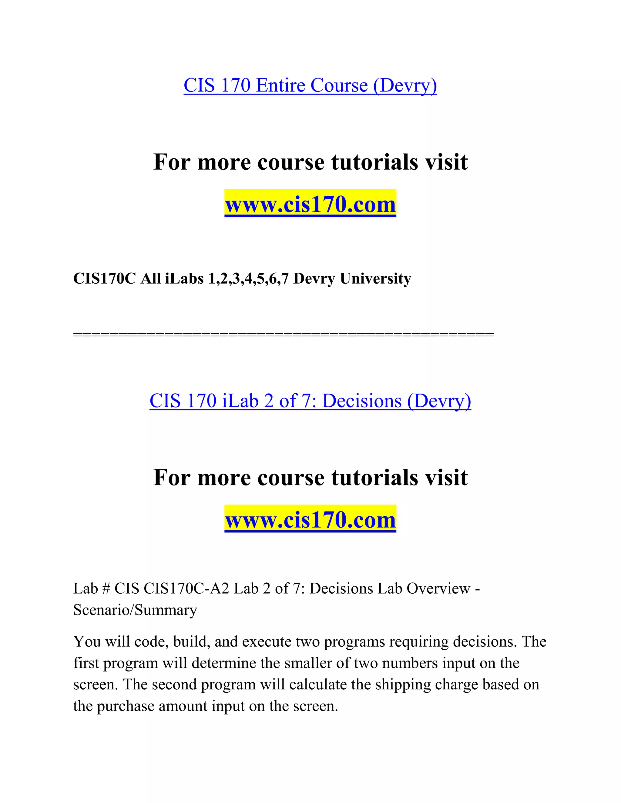 This document provides instructions for completing a programming lab assignment involving decisions and calculations in C++. The lab contains two parts: [1] A program that determines the smallest of two user-input numbers or displays that they are equal. [2] A program that calculates a shipping charge based on the cost of a user-input purchase amount according to a price table. The document provides sample outputs, pseudocode for the program logic, and step-by-step instructions for creating, building, running and capturing the output of the programs in Visual Studio.