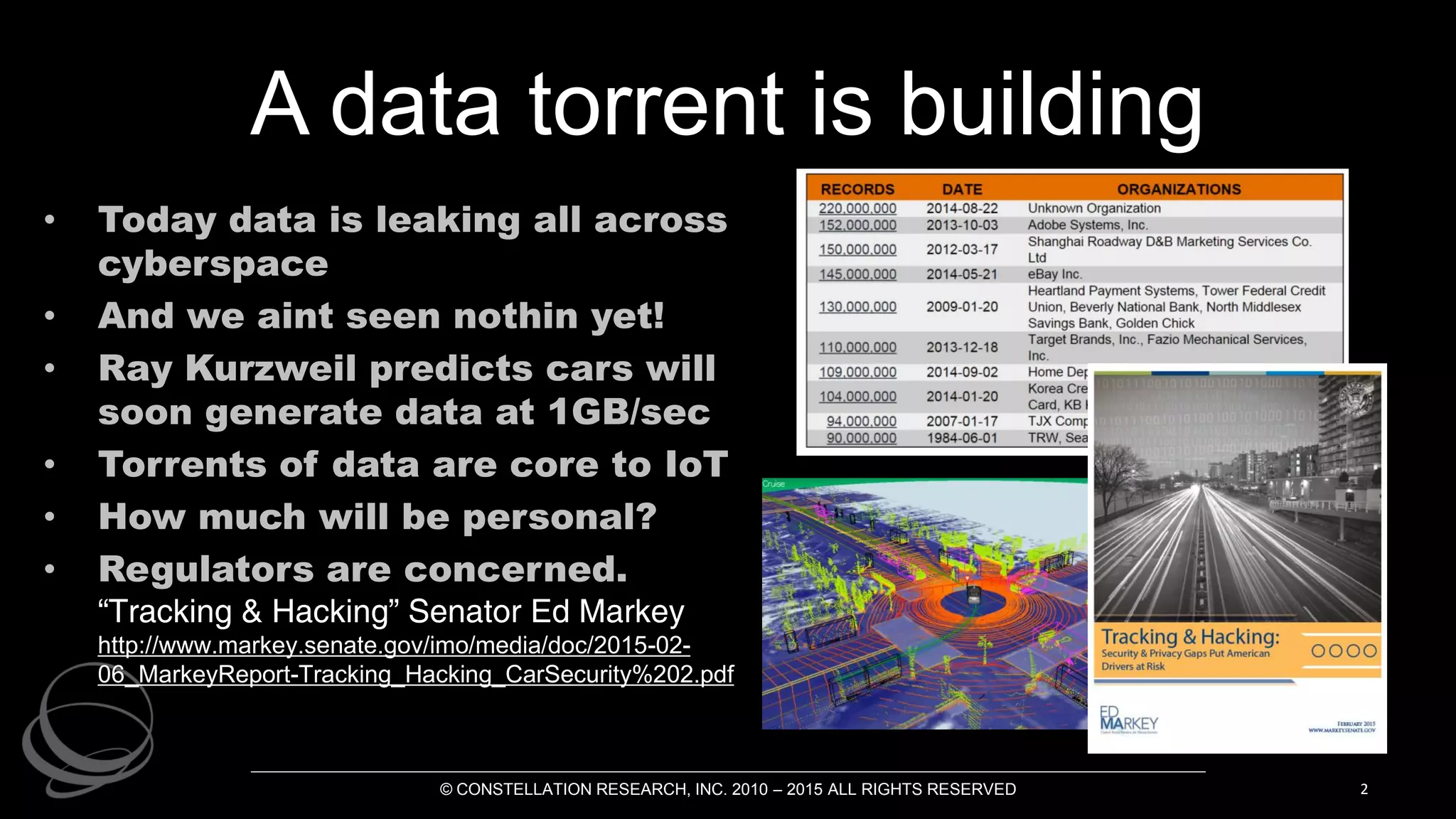 The document discusses the challenges and implications of personal data privacy in the context of the Internet of Things (IoT), highlighting the pervasive nature of data collection by various connected devices, including smart TVs and cars. It raises concerns about the effectiveness of consent mechanisms in online platforms due to misuse and misunderstanding, particularly in light of historical examples like Facebook's data usage policy. The document emphasizes the need for clear privacy policies for every device and suggests that users should be vigilant about the information they share and the settings they choose on social media.