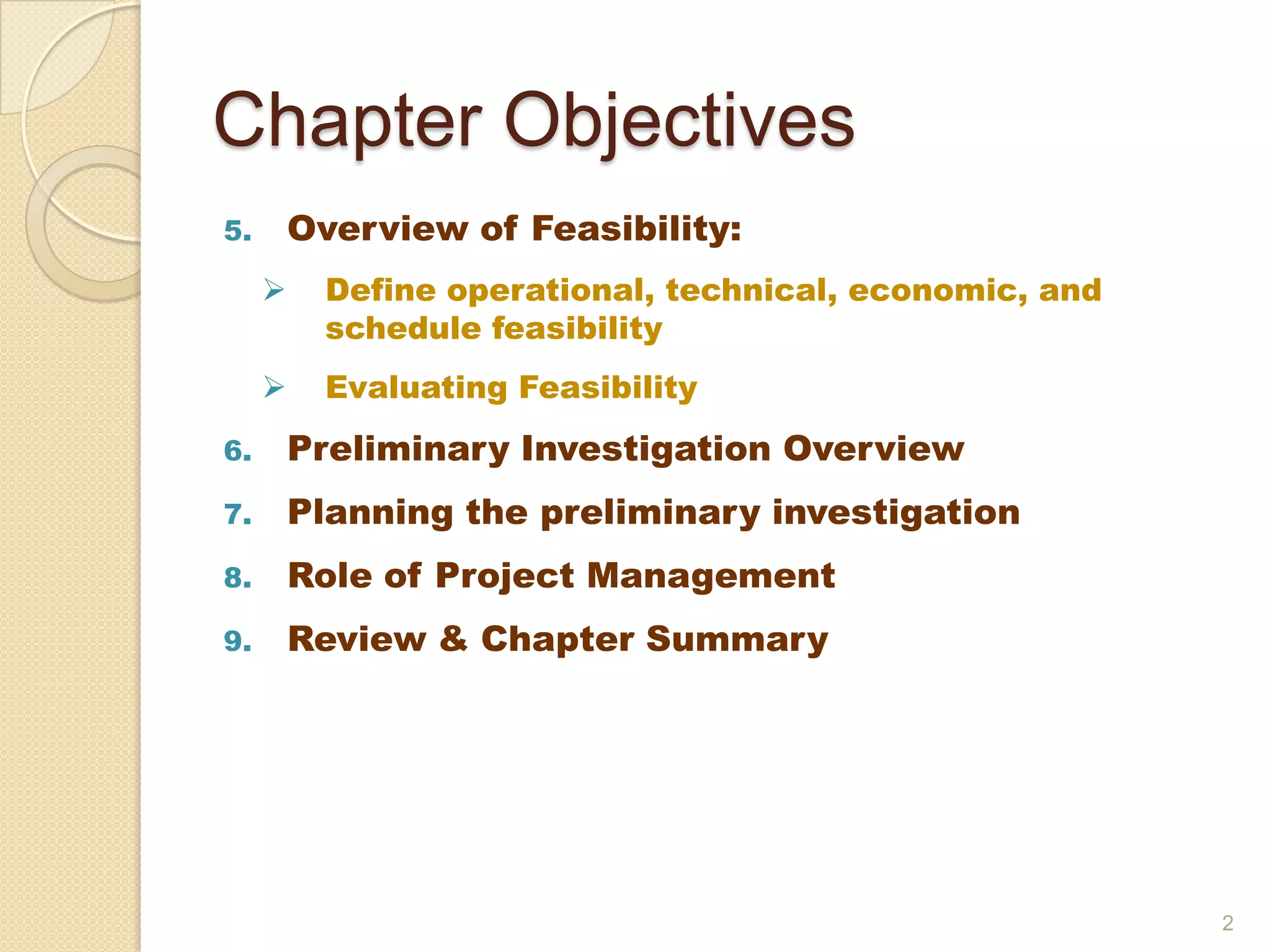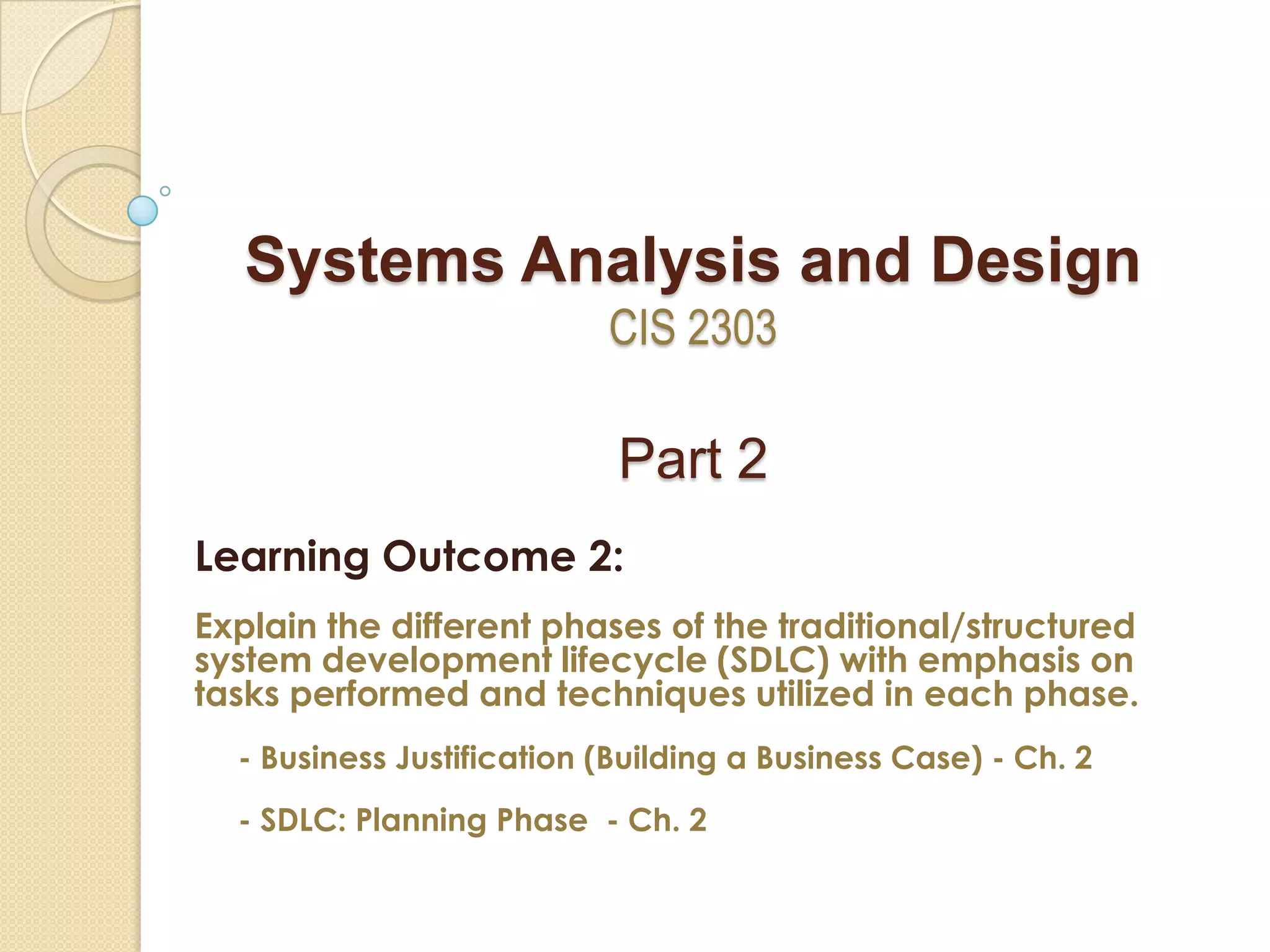 The document discusses the planning phase of the systems development lifecycle (SDLC). It covers the tasks involved in conducting a preliminary investigation to assess the feasibility of a proposed IT project, including: