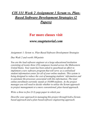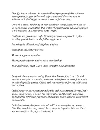 The document outlines a series of assignments for a software engineering course, each requiring students to explore various methodologies, such as Scrum and plan-based development, and create UML diagrams and software requirement specifications. Each assignment has distinct goals, like analyzing architectural patterns, developing software systems, and preparing organizational reports on software development challenges. The instructions emphasize the need for structured reports adhering to specific formatting guidelines and the inclusion of visual representations of solutions.