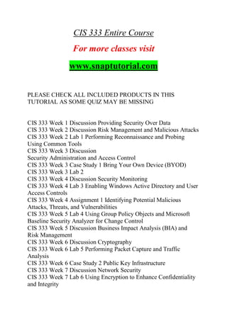 The document outlines the curriculum and activities for the CIS 333 course, covering various topics related to information systems security over 11 weeks, including discussions on risk management, cryptography, network security, and malware impact. It includes lab exercises for hands-on learning, case studies, and a final exam with multiple sets of questions that assess knowledge on key security concepts. The course emphasizes a practical approach to cybersecurity education through discussions, assignments, and participation.