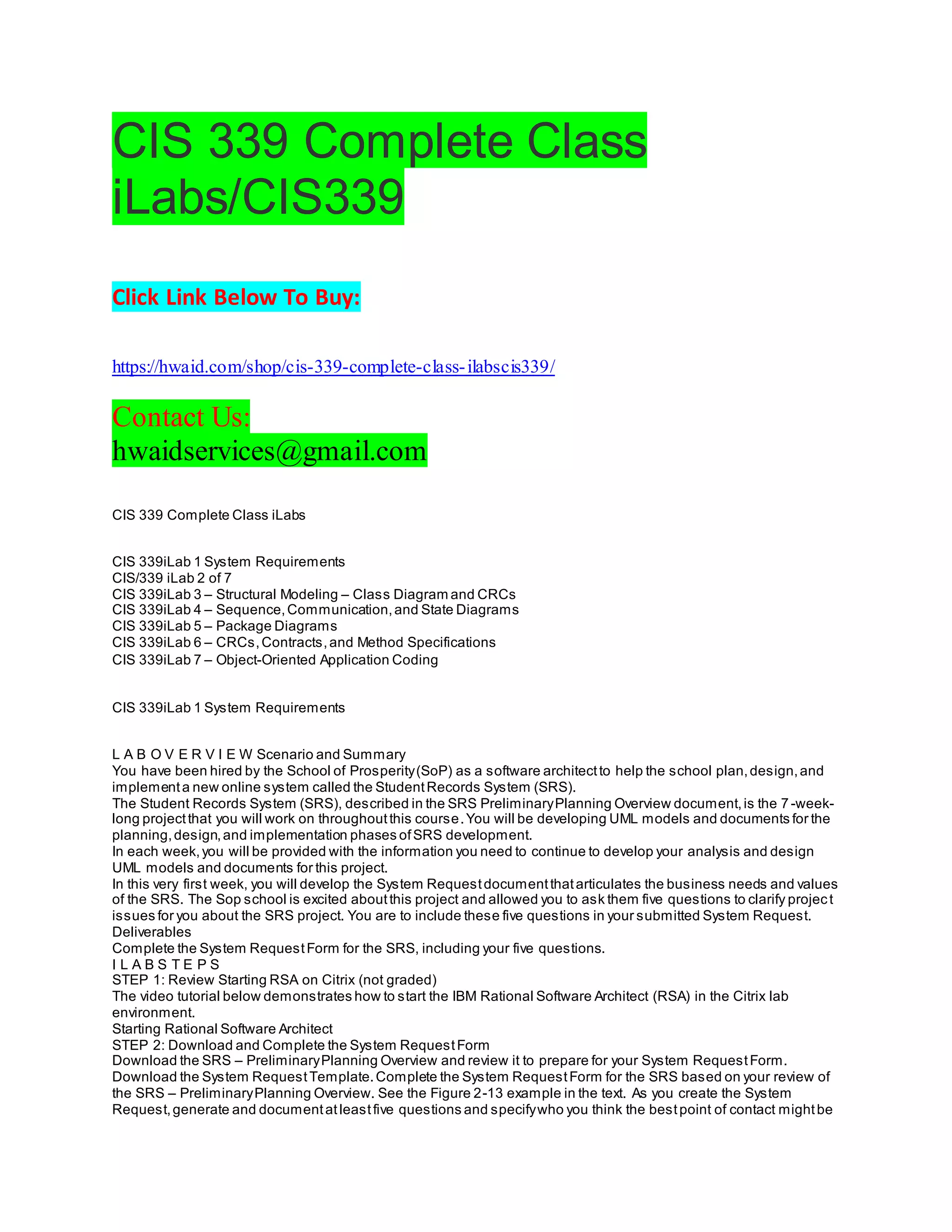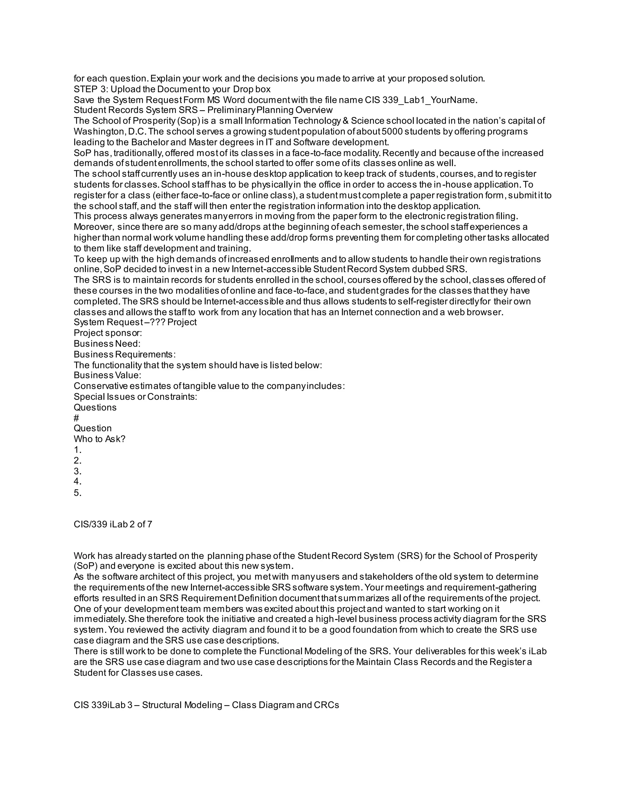 The document outlines a course (CIS 339) involving the development of a new online Student Records System (SRS) for the School of Prosperity (SOP). It includes detailed lab assignments that guide students through the phases of system planning, design, and implementation, focusing on UML models and programming skills. Deliverables throughout the labs include system request forms, UML diagrams, method contracts, and coding assignments ultimately aimed at building a functional SRS application.