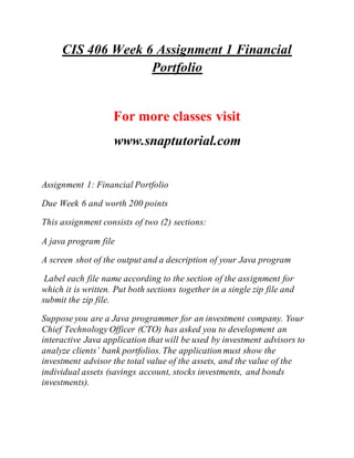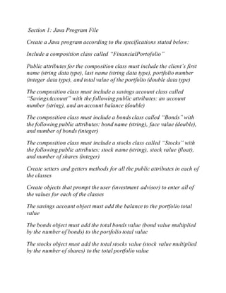 The document outlines assignments for a Java programming course, including the development of an interactive financial portfolio application and a learning management tool called 'ugrade.' The first assignment requires creating a Java program that computes total asset values for clients' bank portfolios, while the second involves allowing users to enter and sort names and grades using parallel arrays. Each assignment consists of coding requirements and a description, along with grading criteria focused on usability, readability, and proper programming practices.