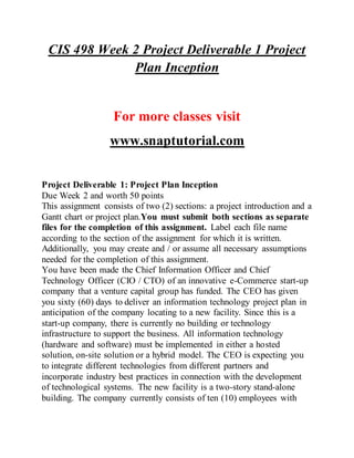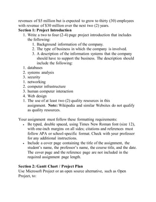 This document outlines the requirements for a series of project deliverables for a capstone course in information systems, including project plans, business requirements, database designs, and infrastructure solutions for an e-commerce start-up. Each deliverable consists of specific sections that must be completed and submitted separately, with a focus on integrating technology solutions to support business operations. Emphasis is placed on quality resources, adherence to formatting guidelines, and incorporation of project management tools like Gantt charts.