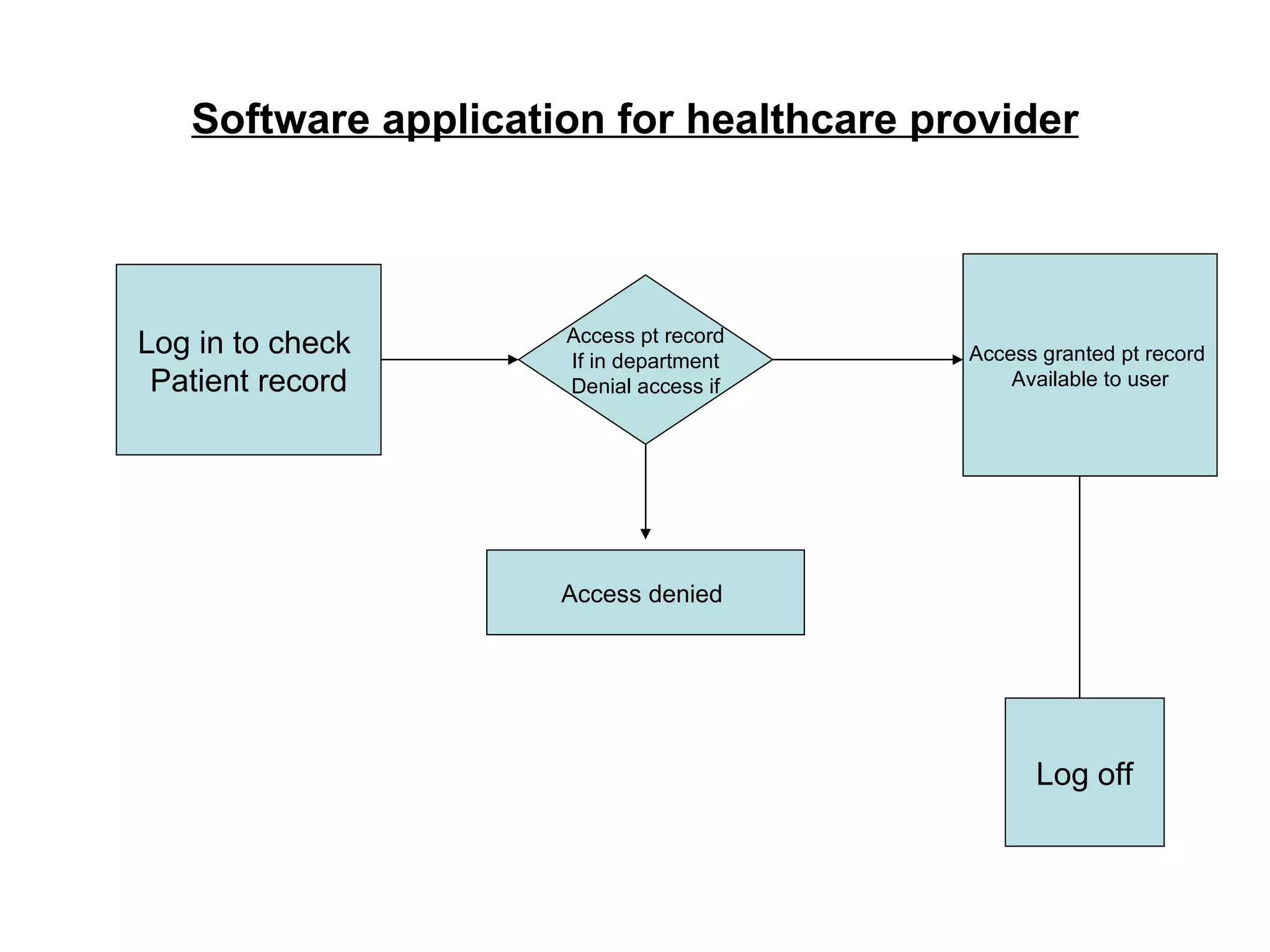 This document outlines the process for a healthcare provider to access a patient's record through a software application. The provider must first log in to check the patient's record. If the patient's record is in their department, access is granted; otherwise, access is denied. Once access is granted, the patient's record becomes available for the user to view before logging off the system.