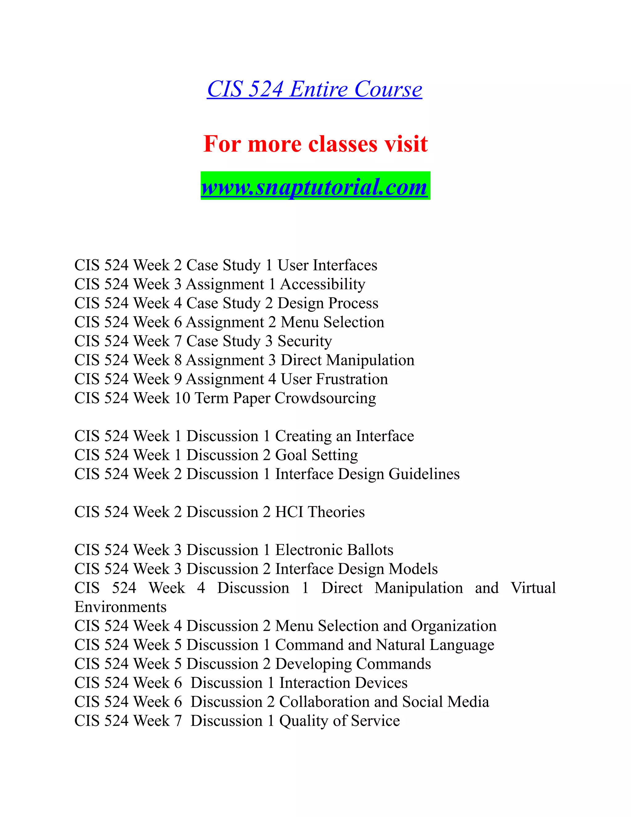 The document outlines the coursework and assignments for the CIS 524 class, focusing on various aspects of human-computer interaction (HCI) and user interface design. It includes discussions, case studies, and assignments on topics such as accessibility, usability, interface design guidelines, and interaction devices. Through these assignments, students are expected to explore theoretical and practical elements of designing user-friendly interfaces while considering diverse user needs.