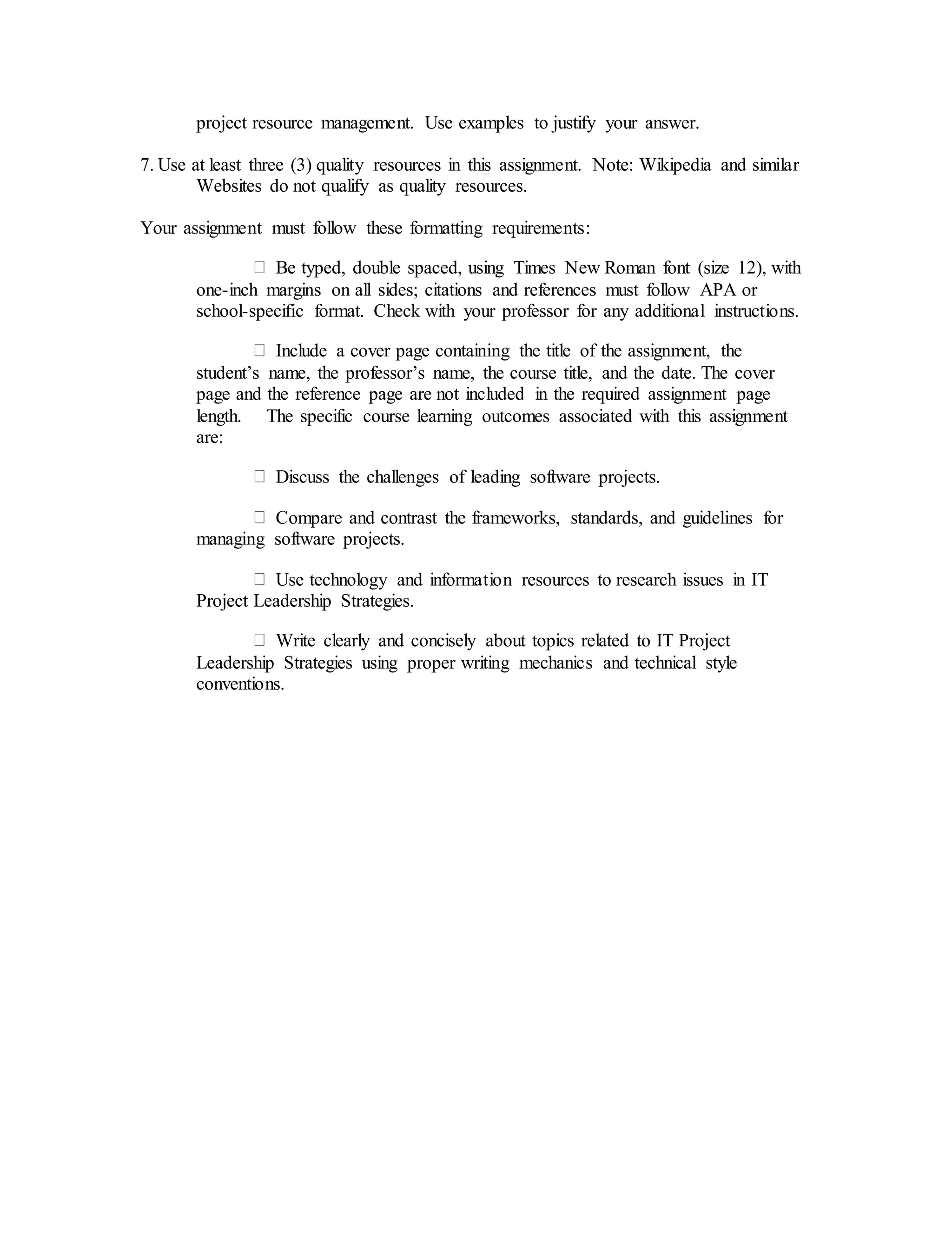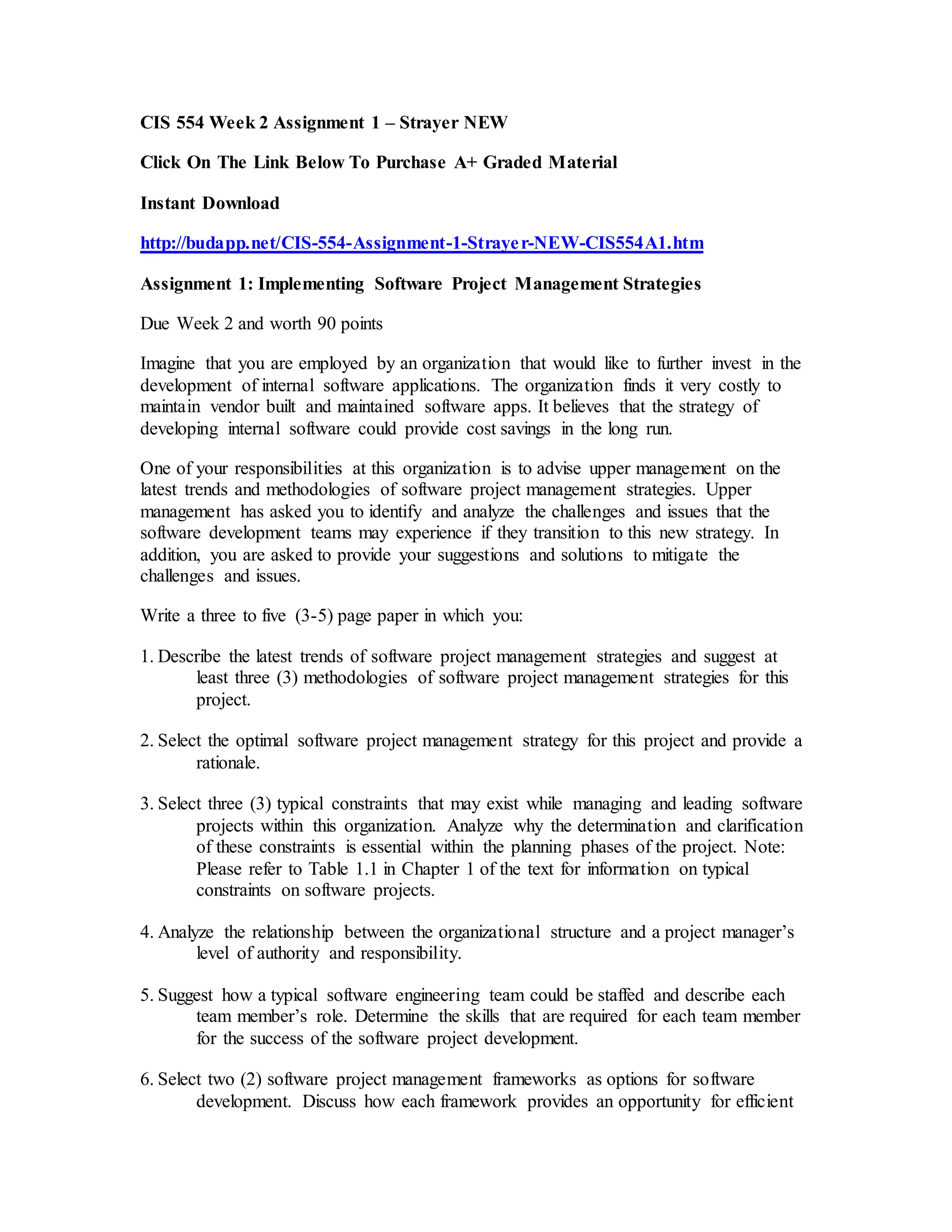 1. The document provides an assignment for a course on software project management strategies. It asks students to analyze challenges an organization may face transitioning to internal software development and provide recommendations to address those challenges.