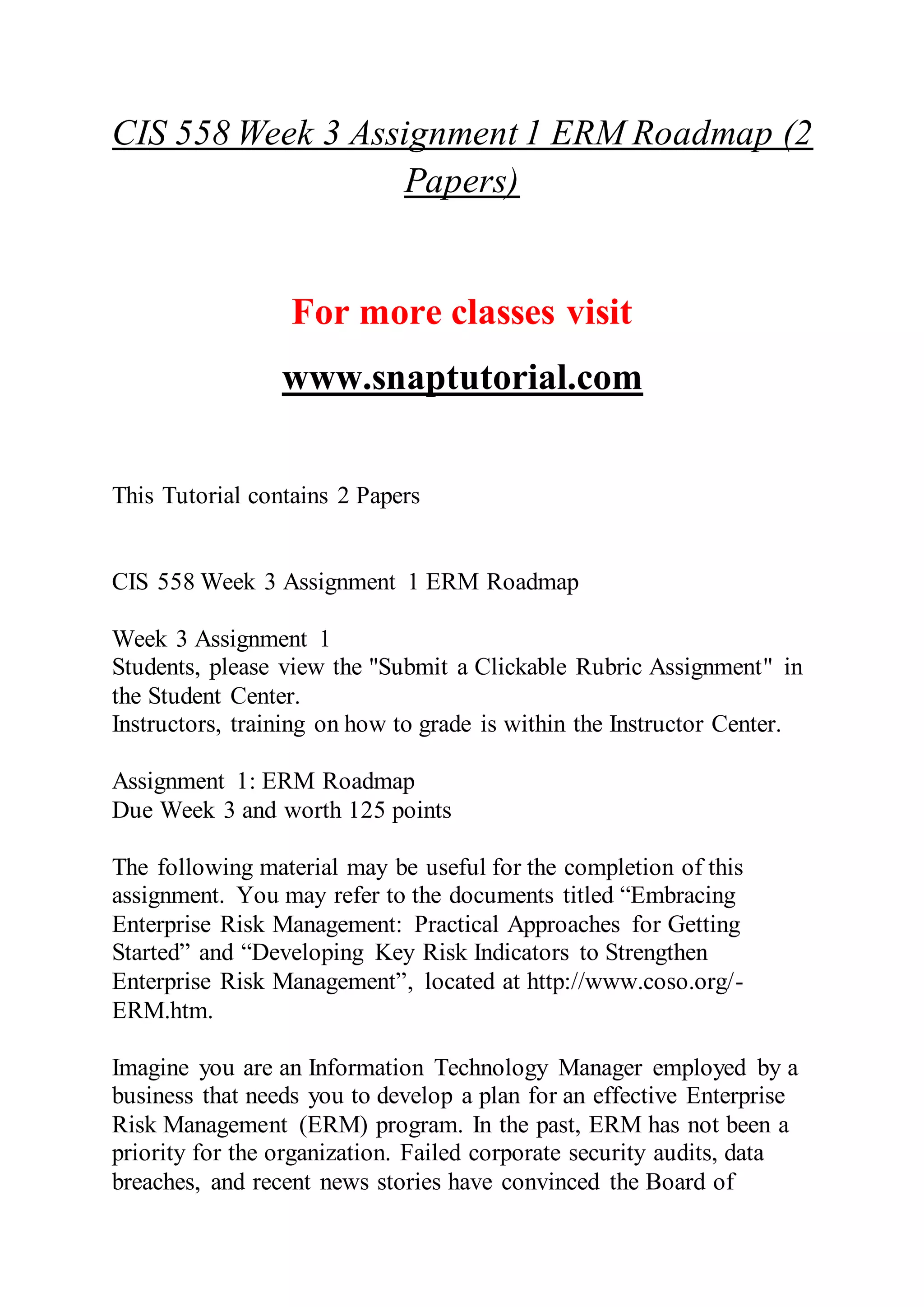 The document outlines a series of assignments for a course focused on enterprise risk management (ERM), information technology audits, and cloud computing risks. Each assignment requires students to analyze frameworks, propose implementation strategies, and assess risks associated with IT governance and compliance, particularly regarding HIPAA and CMMI levels. Additionally, the document includes specific formatting requirements and expectations for the use of quality resources.