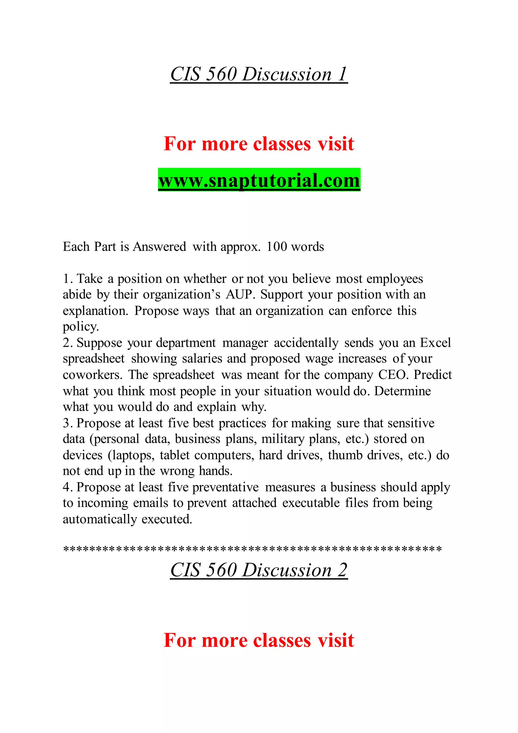 This document contains discussion questions and assignment prompts for 14 weeks of a CIS 560 course on security access and control strategies. It includes questions on access control policies, single sign-on authentication, encryption, and mitigating risks from human behavior. The final assignment asks students to propose techniques for organizations to address threats from human nature.