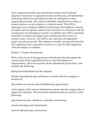 The document outlines the requirements for multiple project deliverables in a course assignment focused on developing a project plan for a merger between two companies. It stipulates the need for a project introduction and plan, business requirements documentation, database design, and cloud technology assessment, each with specific formatting and content requirements. Each section must be submitted separately and should include elements such as operational systems, data warehousing, and necessary technology integrations.
