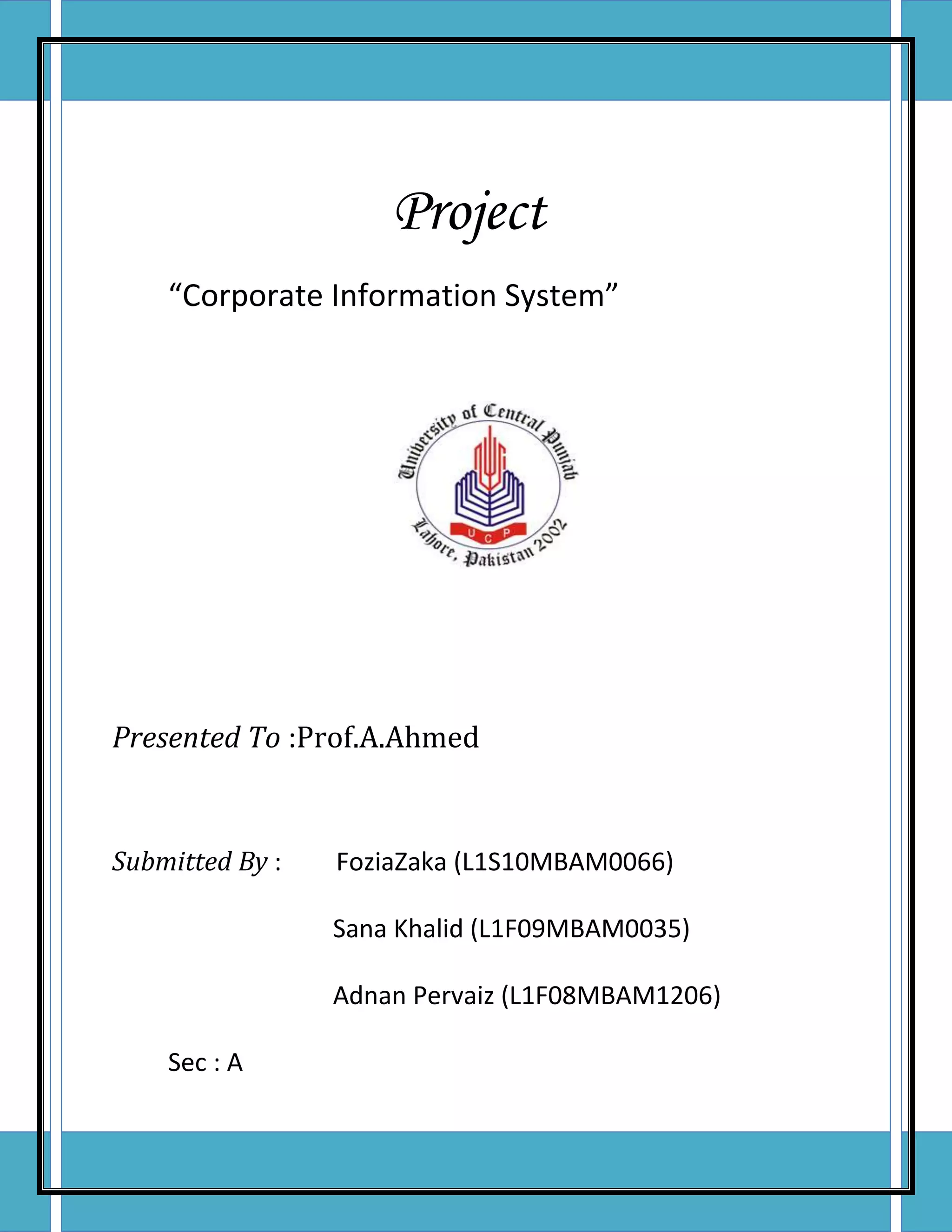 The document provides details about the "Corporate Information System" project presented to Prof. A. Ahmed by three students. It discusses the Pakistan Telecommunication Company Limited (PTCL), including its history, goals, activities and timelines for automating the training and development system over 46 days. Key aspects covered include requirement analysis, feasibility analysis and identifying problems with the current manual system to recommend automated solutions.