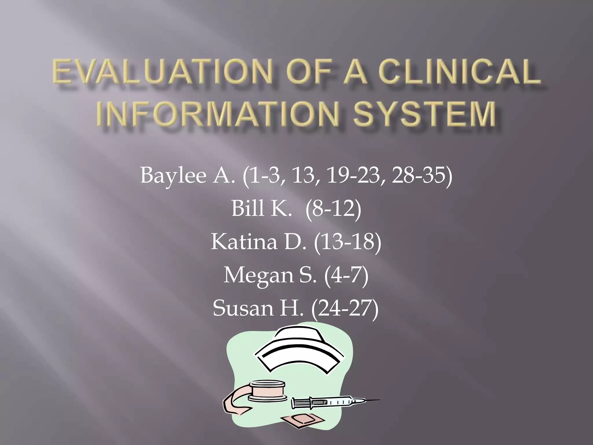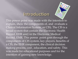 This powerpoint evaluates a clinical information system (CIS) used in a hospital. It describes the key components of a CIS including the electronic health record (EHR), benefits like increased safety and communication, and important players in the system's development like medical staff, IT, and nursing informatics. It also addresses costs, which can be high initially but result in long-term savings, the importance of clinical decision support and regular updates, and ensuring user safety, security, and education on the system.