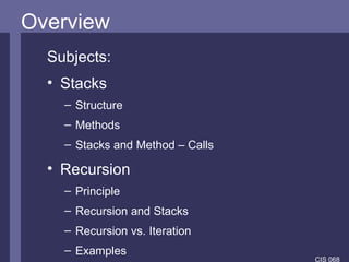 The document introduces stacks and recursion. It defines stacks as LIFO data structures and discusses how they are used in programming, particularly in method calls and the JVM. Recursion is introduced as a problem-solving technique that breaks problems down into smaller instances of the same problem. It notes recursion uses stacks to store information during method calls and provides examples of recursive algorithms and problems.