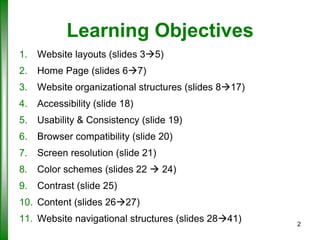 The document outlines key concepts for designing and organizing a website, covering topics such as layout structures, homepage essentials, organizational structures, accessibility, usability, and navigational elements. It emphasizes the importance of clear navigation, consistency, and browser compatibility while providing guidelines on content presentation, color schemes, and screen resolution. The document serves as a comprehensive guide for creating effective and user-friendly web pages.