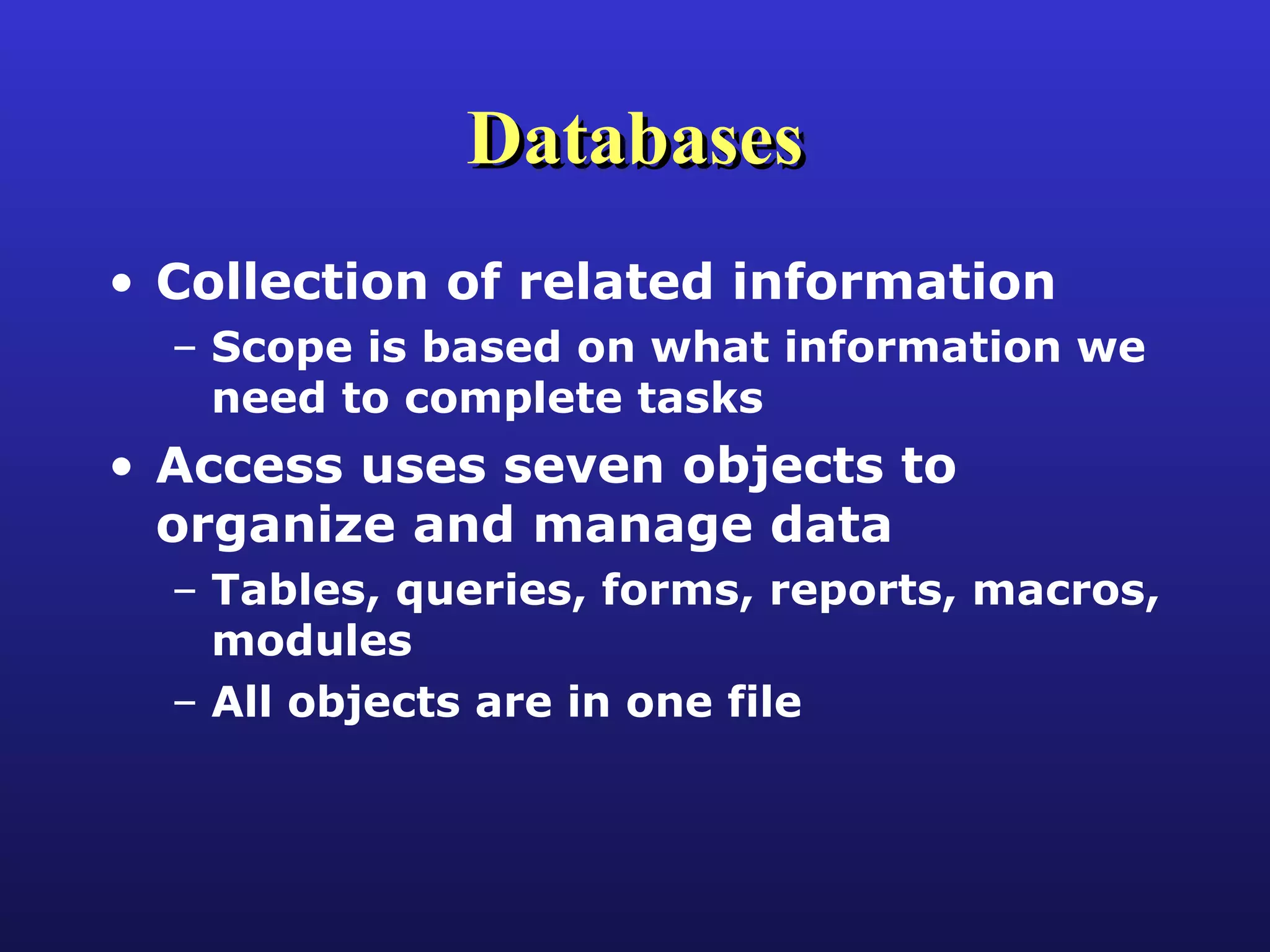 This document provides an overview of key concepts for working with databases in Microsoft Access, including tables, queries, forms, reports, and relationships. It discusses table design, field data types, properties, validation rules, and referential integrity. It also covers topics like one-to-many and many-to-many relationships, joins, parameters, and action queries. Forms and reports are discussed, including their use of sections, controls, sorting, grouping, and subforms/subreports.