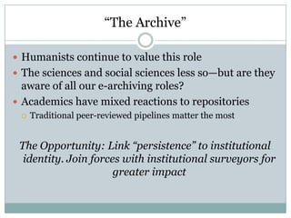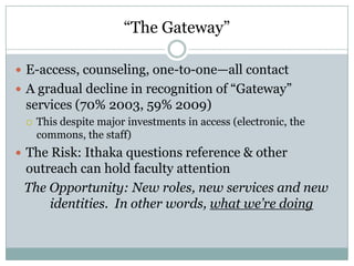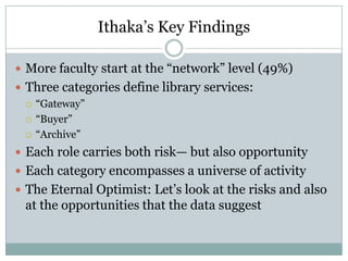The document discusses library surveys of faculty use and needs. It highlights two exemplary survey programs: the University of Washington Libraries Faculty Library Use Survey and the Emory University Library Survey. These surveys provide longitudinal data on topics like faculty productivity, resource usage, and satisfaction. The document also notes some key findings from these surveys, such as high ratings for electronic journals and assistance from library staff. Additionally, it outlines some broader trends identified in faculty survey research, such as the importance of formal information sources over informal ones.
