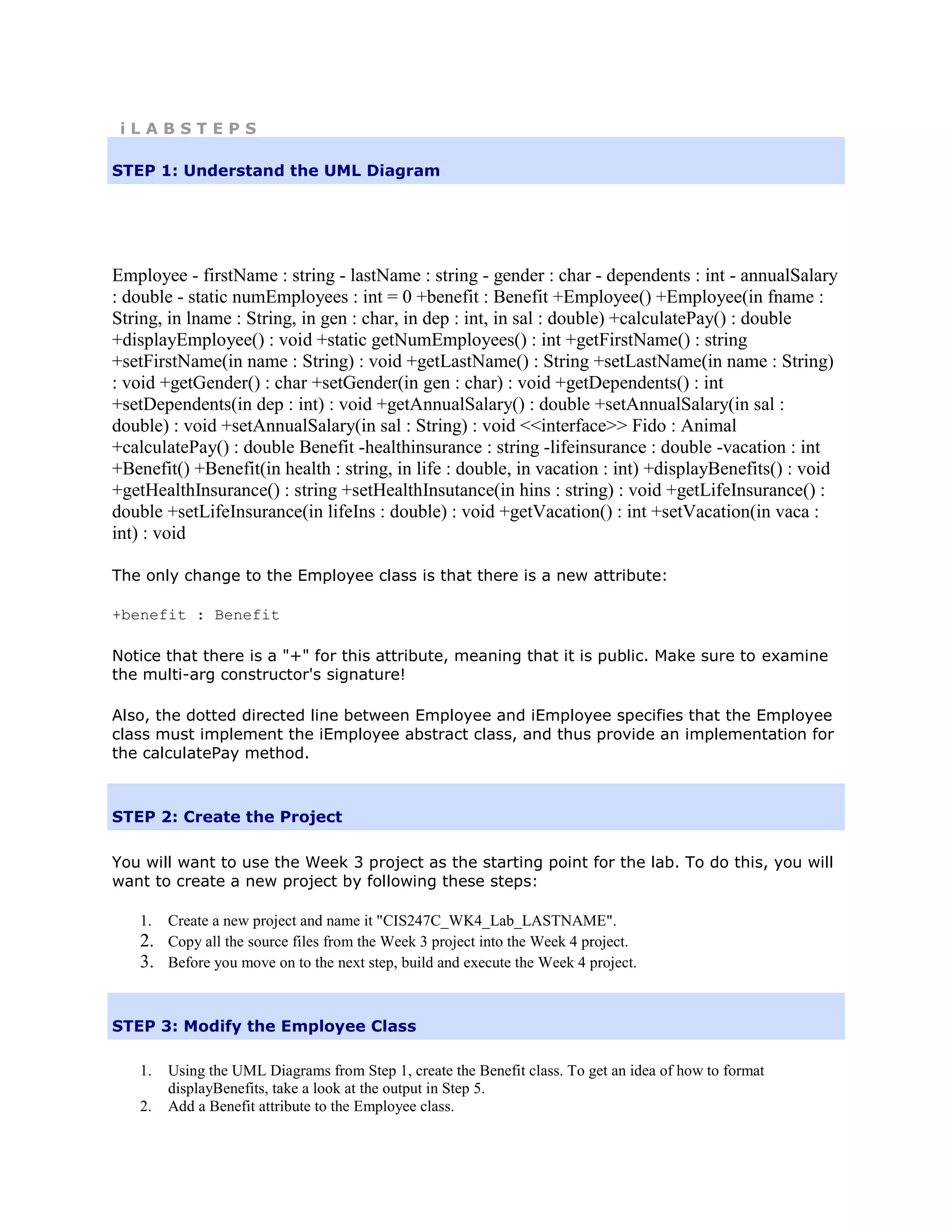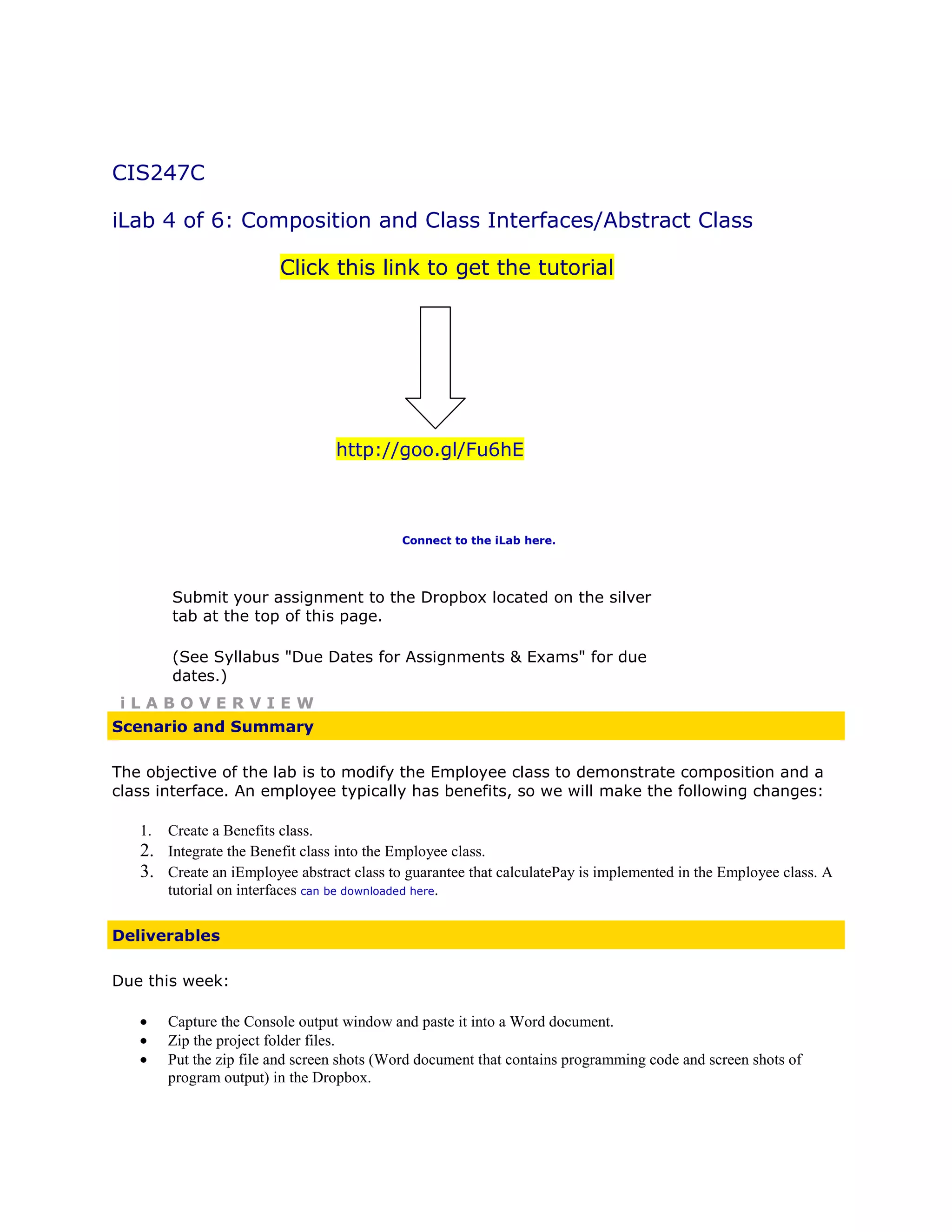 The objective of the lab is to modify the Employee class to incorporate composition with a Benefits class and implement an abstract iEmployee interface. Students are instructed to create a Benefits class, integrate it into the Employee class by adding a Benefit attribute, and make Employee inherit from the abstract iEmployee interface requiring implementation of calculatePay. The main method is updated to demonstrate use of the new Benefits object by prompting the user for benefit details and displaying employee information along with their assigned benefits.