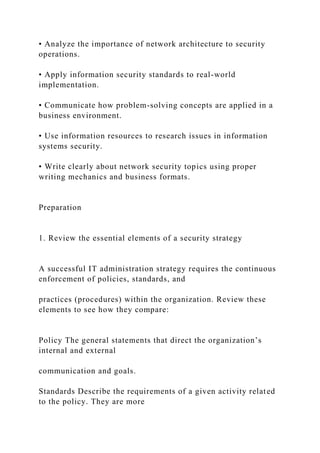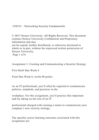 This document outlines an assignment for IT professionals at Strayer University, requiring the creation of a memo to communicate a new security strategy for a fictional company located in a shopping mall. It emphasizes the importance of defining security policies, standards, and practices, while also requiring the assessment of the business environment and the development of necessary documentation. The assignment is structured to help students analyze and articulate security concepts relevant to real-world IT scenarios.
