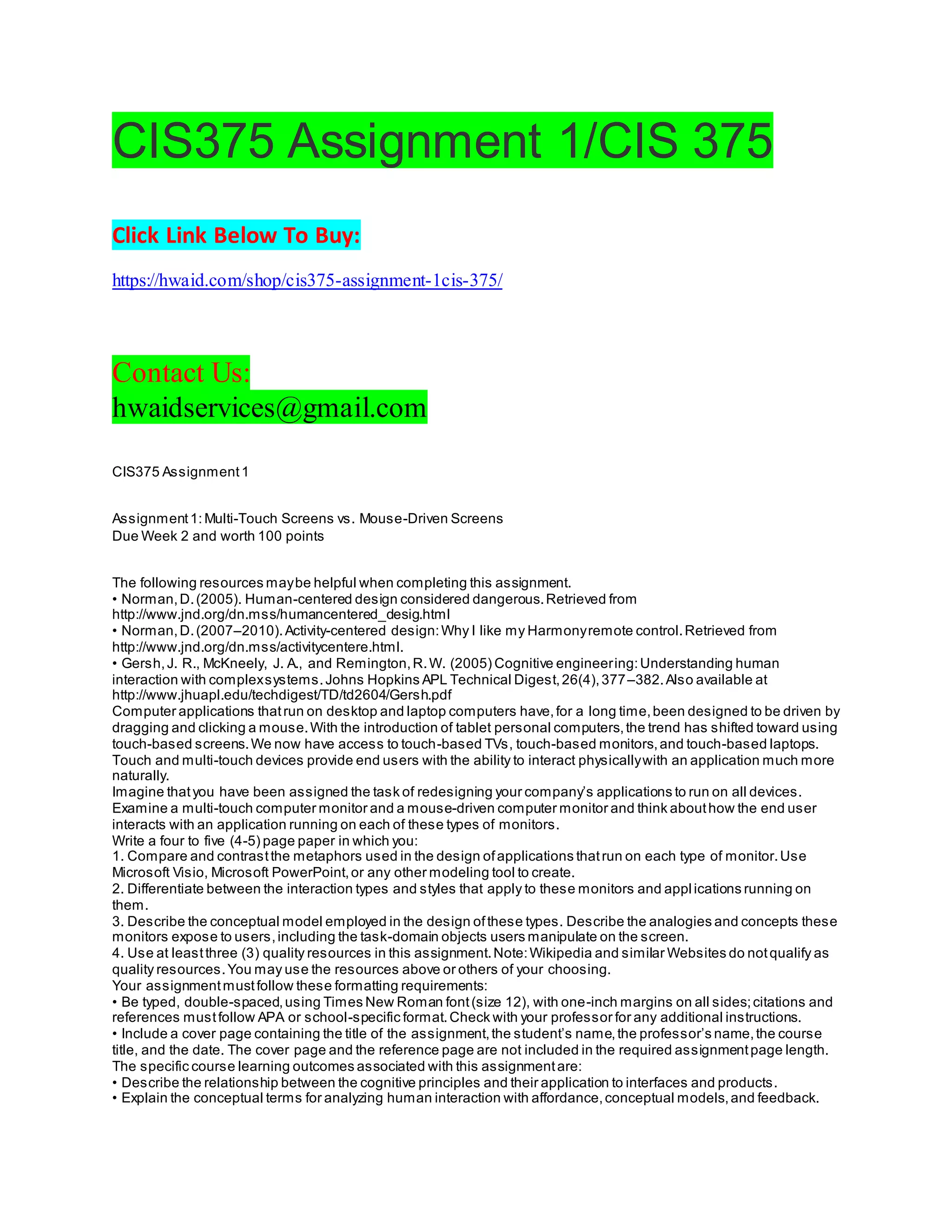 The document outlines a CIS375 assignment focused on comparing multi-touch screens and mouse-driven screens, with an emphasis on user interaction and design metaphors. Students are tasked with writing a 4-5 page paper that examines interaction styles, conceptual models, and the differences in application designs for each monitor type, using quality resources for reference. Specific formatting requirements and learning outcomes related to cognitive principles and human-computer interaction are also provided.