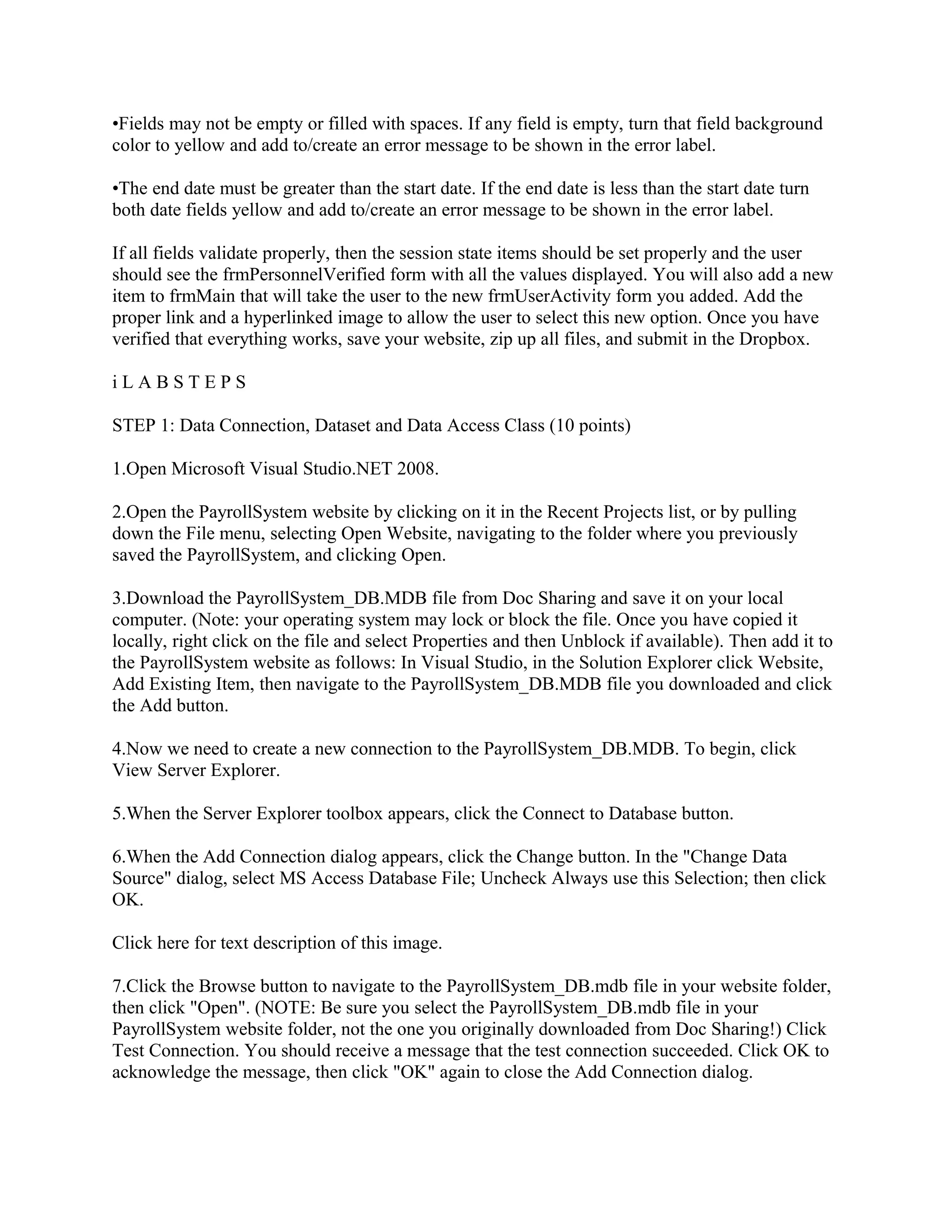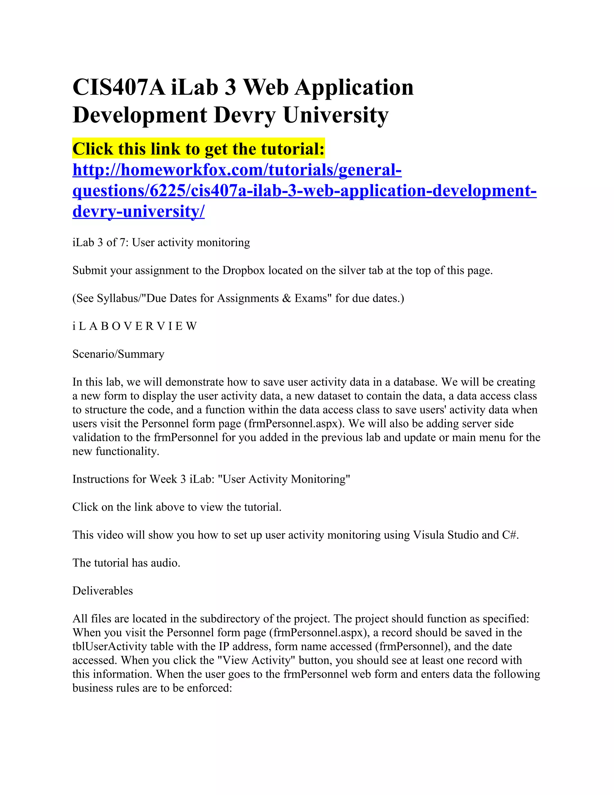 This document provides instructions for completing iLab 3 of the CIS407A course at Devry University. The lab involves adding user activity monitoring functionality to an existing payroll system website. Students are instructed to create a database table to store user activity data, add code to save activity data to the table, and display the activity data on a new web form. Validation logic is also added to an existing personnel form to validate field values. Upon completing the tasks and verifying the functionality, students are to submit all project files.