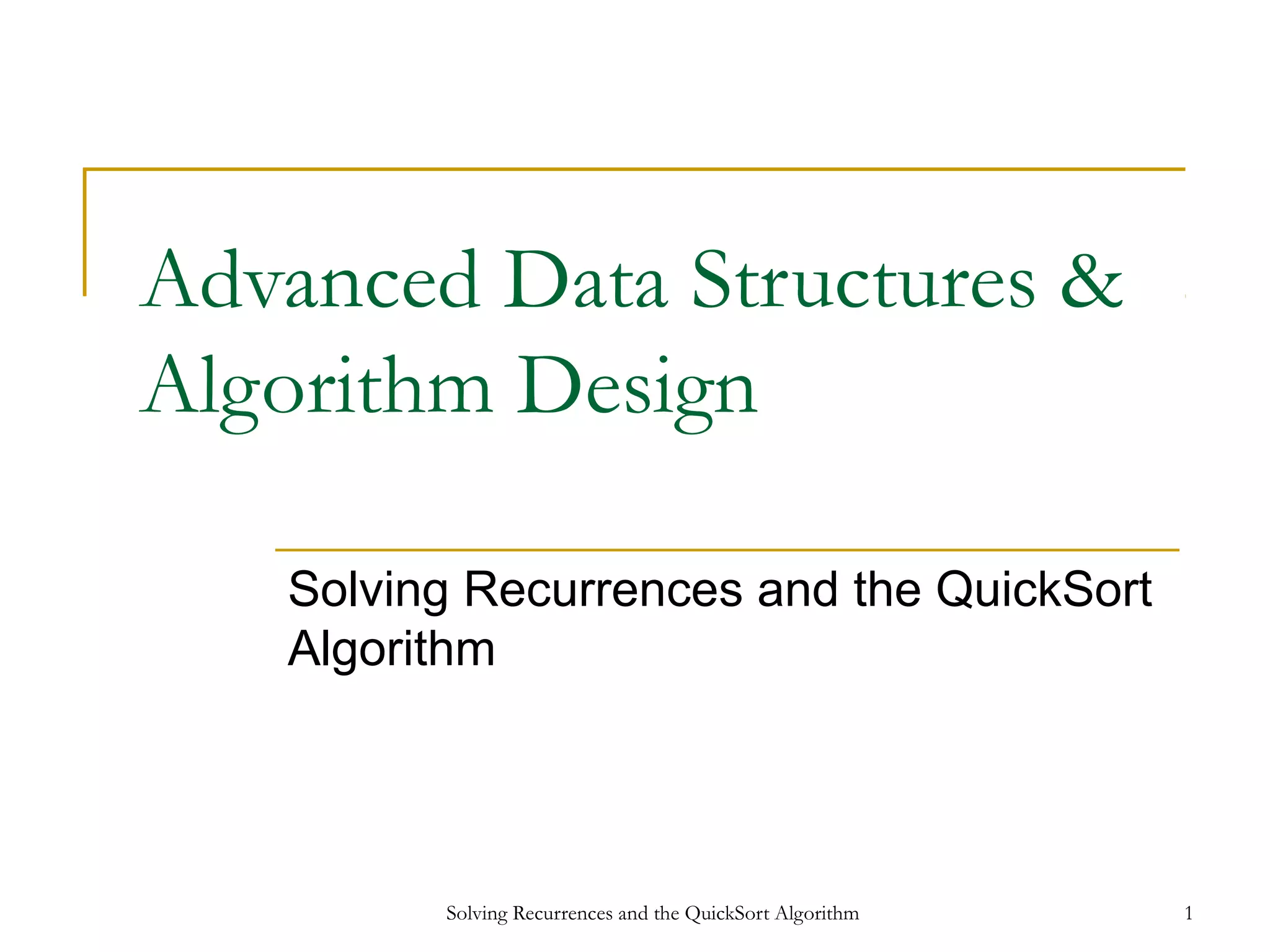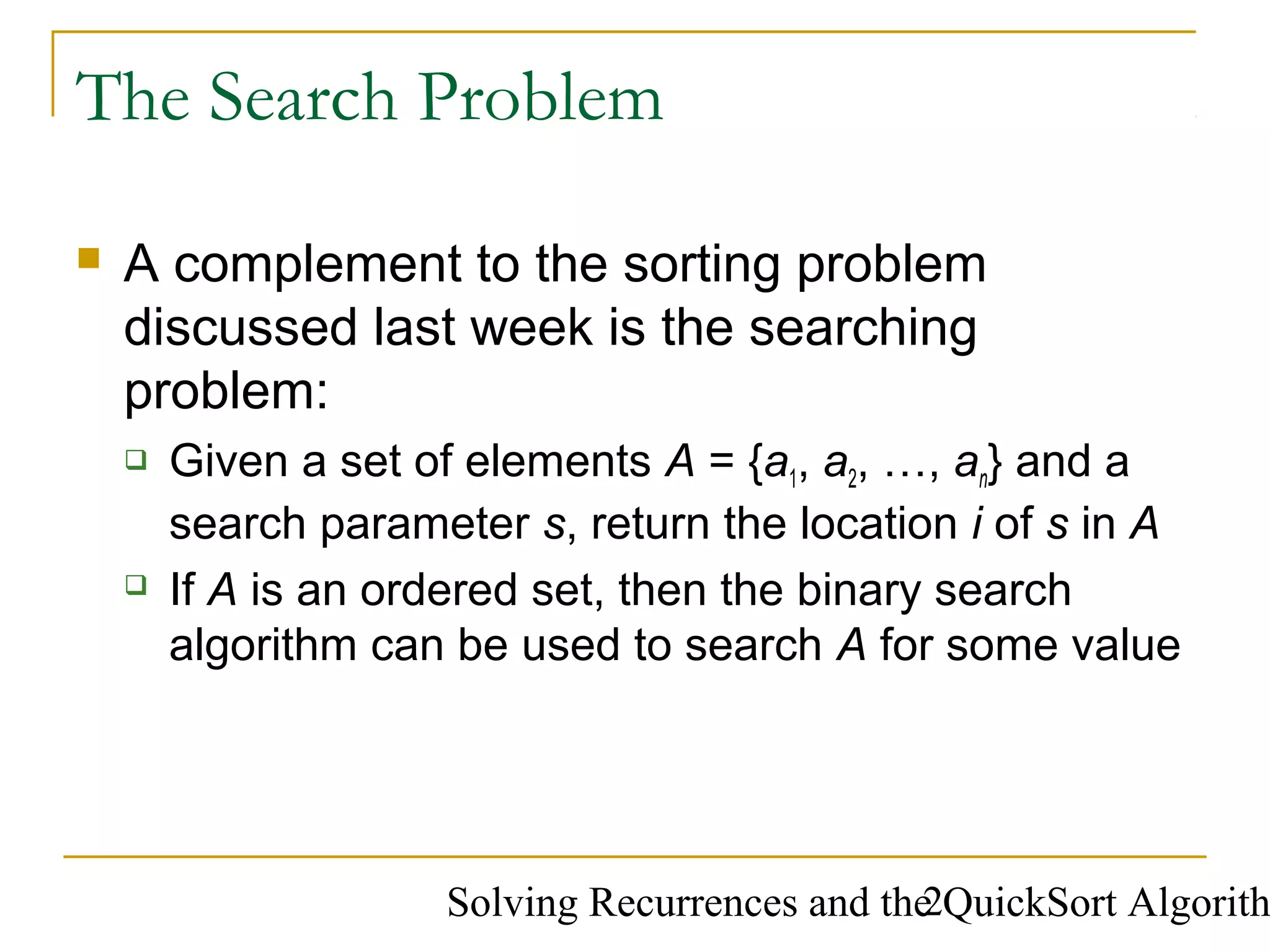 This document discusses algorithms for sorting and searching data structures. It introduces binary search, which can search an ordered array in O(log n) time by recursively searching either the left or right half of the array. Quicksort is also discussed, which works by recursively sorting partitions of the array around a pivot element. In the average case, quicksort runs in O(n log n) time, but in the worst case of an already sorted array it runs in O(n^2) time. The document covers methods for solving algorithm recurrences like substitution, iteration, and the master method, and applies these techniques to analyze the time complexity of binary search and quicksort.
