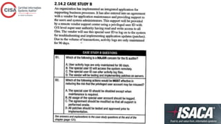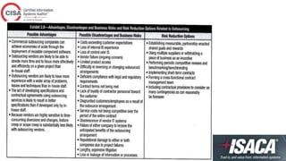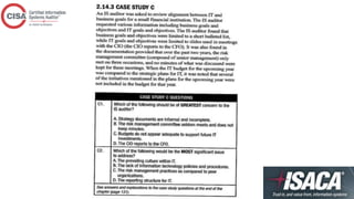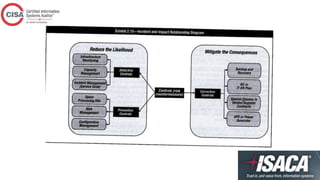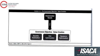 This document provides an overview of topics covered in a CISA review course, including IT governance, corporate governance, governance of enterprise IT, risk management, information security management practices, auditing IT governance structure and implementation, and business continuity planning. The document defines key concepts, best practices, standards, and approaches for each topic. It also outlines the roles and responsibilities of various committees, policies, procedures, and other elements involved in effectively governing enterprise IT.