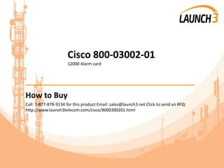 This document provides information about purchasing a Cisco 800-03002-01 12000 Alarm card from Launch 3 Telecom, including how to buy, product details, payment options, shipping and returns policy. Launch 3 Telecom also offers services like equipment repair, maintenance contracts, de-installation, and asset recovery for telecom hardware.