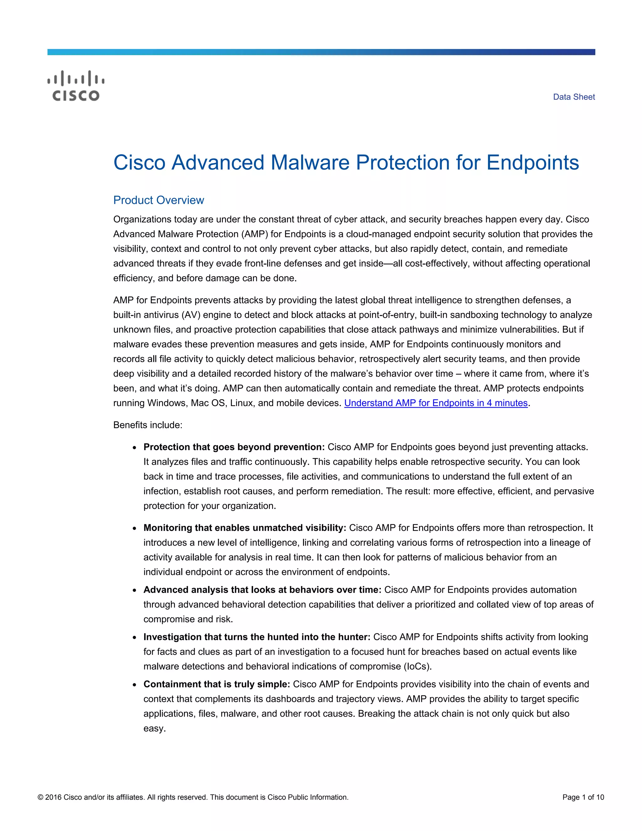 Cisco Advanced Malware Protection for Endpoints is a cloud-managed endpoint security solution that provides visibility, context and control to prevent, detect, contain and remediate advanced cyber threats. It uses continuous monitoring, global threat intelligence, retrospective security capabilities and advanced analysis to uncover hidden malware, understand the full scope of attacks, and automatically contain threats. AMP protects Windows, Mac, Linux and mobile devices from advanced malware in a cost-effective way without slowing systems down.
