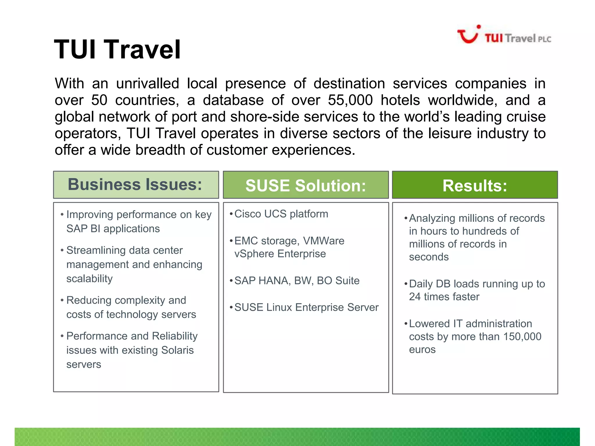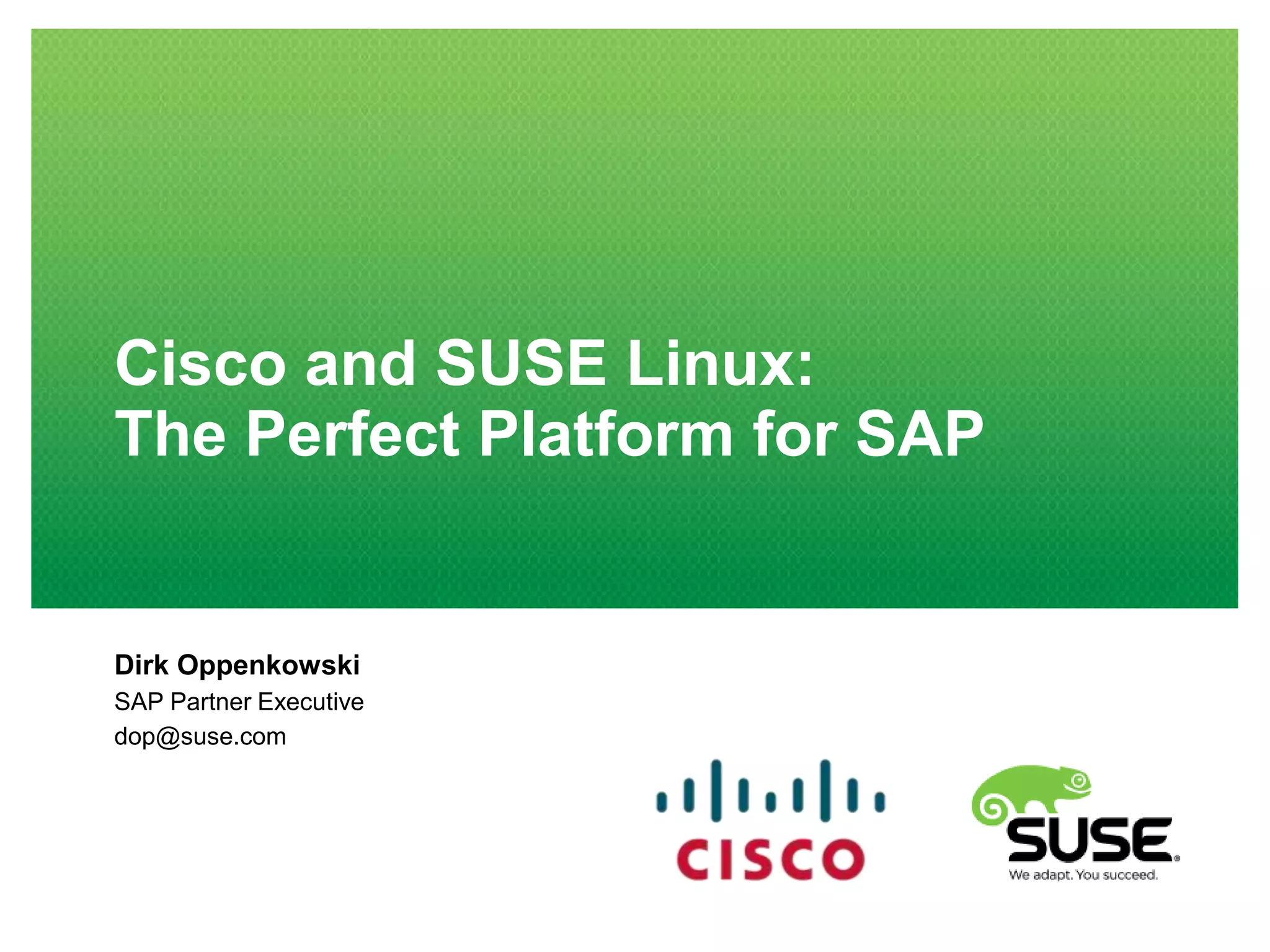 Cisco and SUSE Linux provide a robust platform for SAP, enhancing performance, reducing costs, and improving reliability for businesses like TUI Travel. Leveraging technologies such as Cisco UCS and SUSE Linux Enterprise, organizations can analyze large datasets quickly and streamline data center management. The partnership emphasizes a strong commitment to supporting SAP workloads, with features like built-in high availability and extended support tailored for optimal SAP performance.