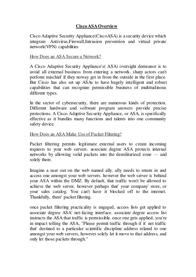 The document provides an overview of Cisco Adaptive Security Appliance (ASA), which integrates antivirus, firewall, intrusion prevention, and VPN capabilities for network security. It explains how ASA uses packet filtering to allow legitimate external requests to access specific web servers in a demilitarized zone (DMZ) while maintaining network security, and discusses its Network Address Translation (NAT) and Port Address Translation (PAT) functionalities that mask internal network addresses. Overall, the ASA serves as a comprehensive security device that effectively protects internal networks from external threats.