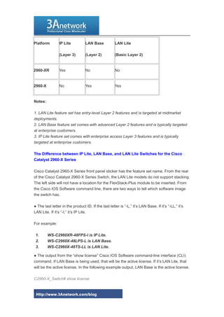 The Cisco Catalyst 2960-X Series are fixed-configuration, stackable Gigabit Ethernet switches that provide enterprise-class access and networking capabilities for campus and branch applications. They support various software-defined capabilities and feature sets including LAN Lite, LAN Base, and IP Lite. The switches are available in several models that vary in port configuration, uplink interfaces, power supply, and other hardware specs depending on the intended use and deployment.