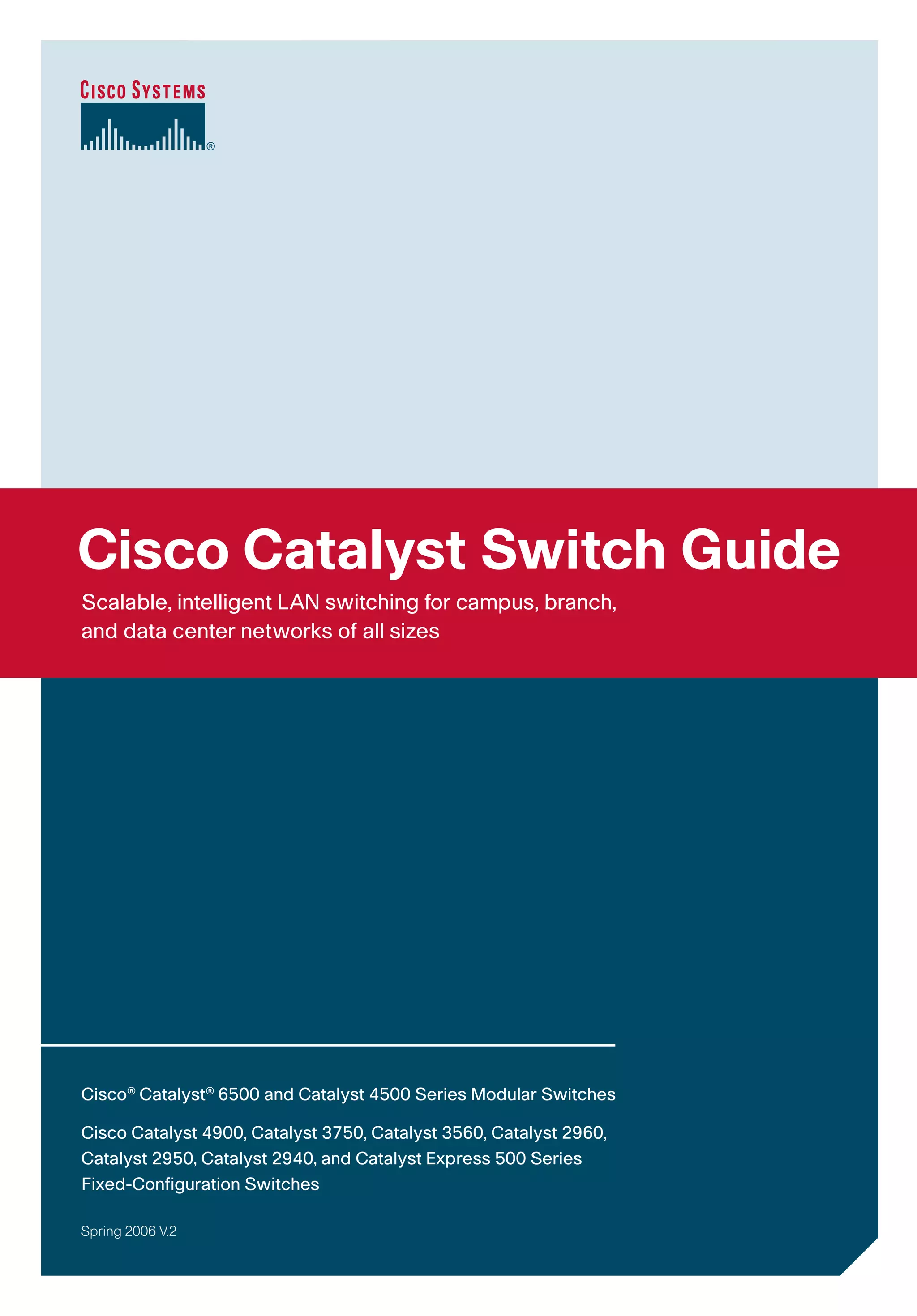 This document provides an overview and quick reference guide for Cisco's Catalyst switch portfolio. It discusses both modular and fixed-configuration switches that are scalable and intelligent, offering high performance switching for campus, branch, and data center networks of all sizes. The switches provide features such as high availability, integrated security, application delivery optimization, and enhanced manageability to support applications, IP voice and video, wireless access, and other network services from the edge to the core.