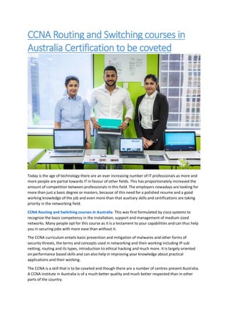 CCNA routing and switching courses in Australia have become important for IT professionals, as employers seek advanced skills and certifications beyond basic degrees. The CCNA certification, recognized by Cisco, demonstrates competency in network installation, management, and security, with various certifications available and no prerequisites for enrollment. With competitive job markets, obtaining a CCNA can significantly enhance career prospects and salary potential.