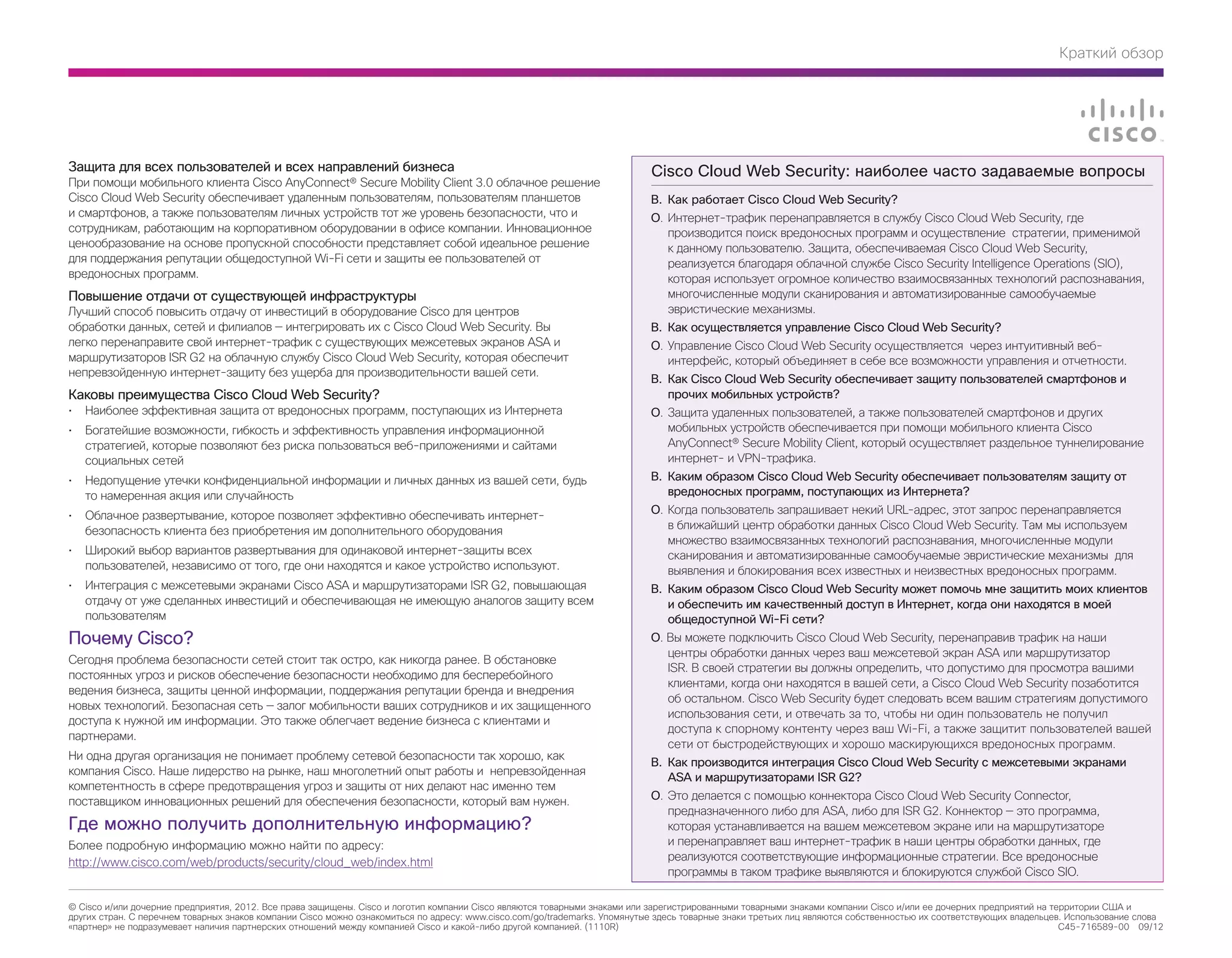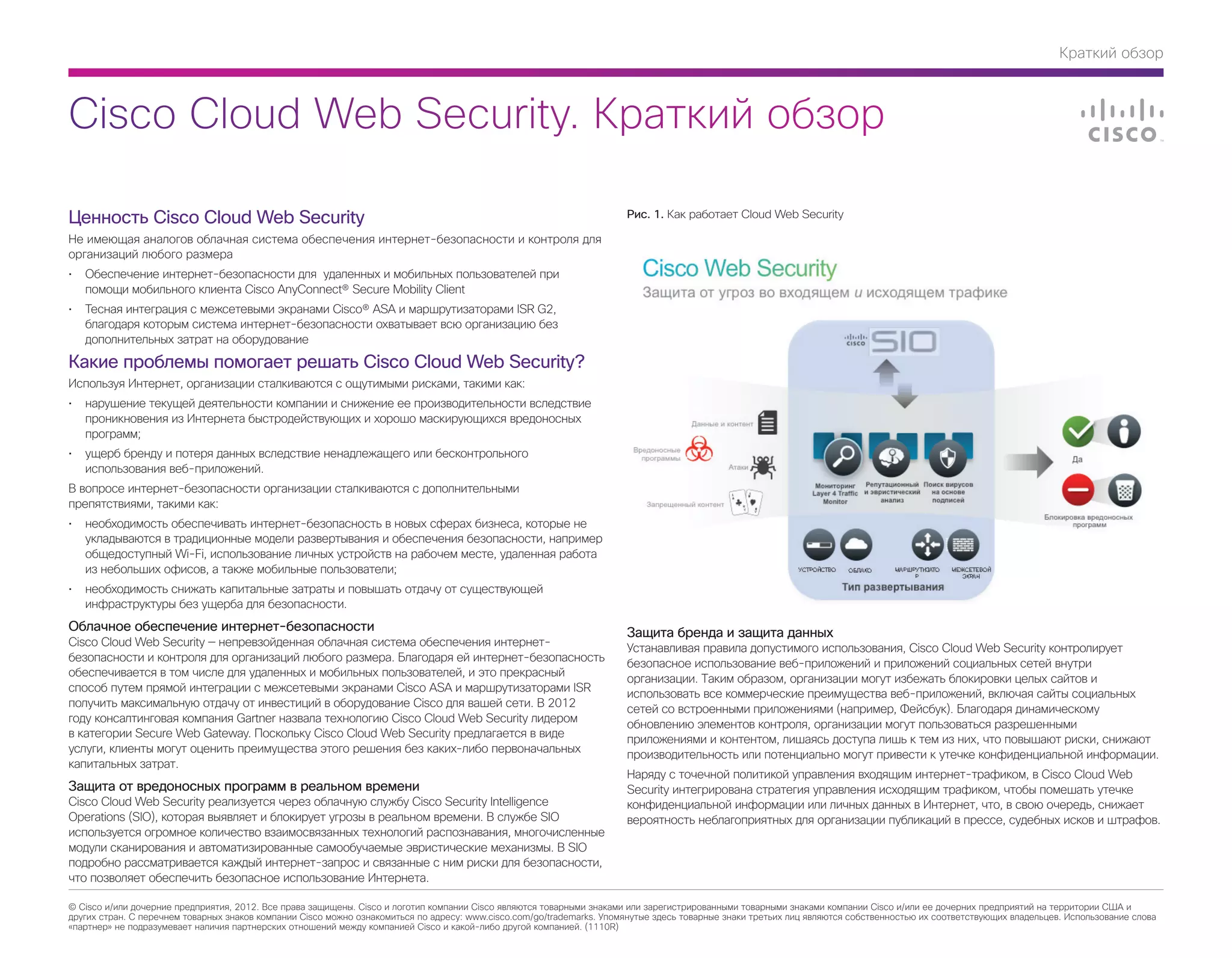 Cisco Cloud Web Security — облачная система интернет-безопасности для организаций, предоставляющая защиту для удаленных и мобильных пользователей через интеграцию с межсетевыми экранами и маршрутизаторами Cisco. Она решает проблемы, связанные с угрозами, утечками данных и необходимостью обеспечения безопасности в новых бизнес-условиях, без дополнительных капитальных затрат. Облачное решение обеспечивает защиту от вредоносных программ и блокирует угрозы в реальном времени с помощью современных технологий анализа и управления интернет-трафиком.
