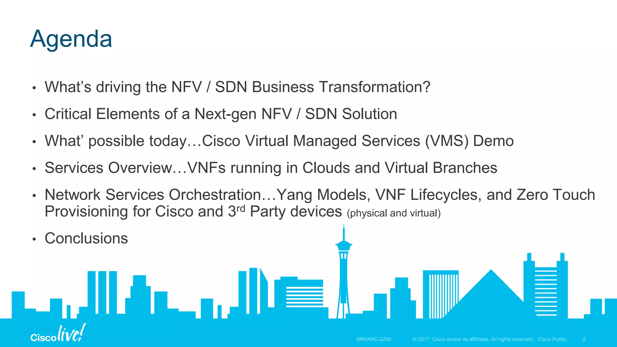 Cisco's Virtual Managed Services (VMS) platform allows service providers to orchestrate and manage SD-WAN and NFV services from the cloud. The demo showed how VMS can rapidly deploy SD-WAN services across multiple sites with MPLS, internet, and LTE links using Cisco routers. VMS provides a multi-tenant cloud management platform that reduces costs and time to market for service providers while improving services for enterprise customers.