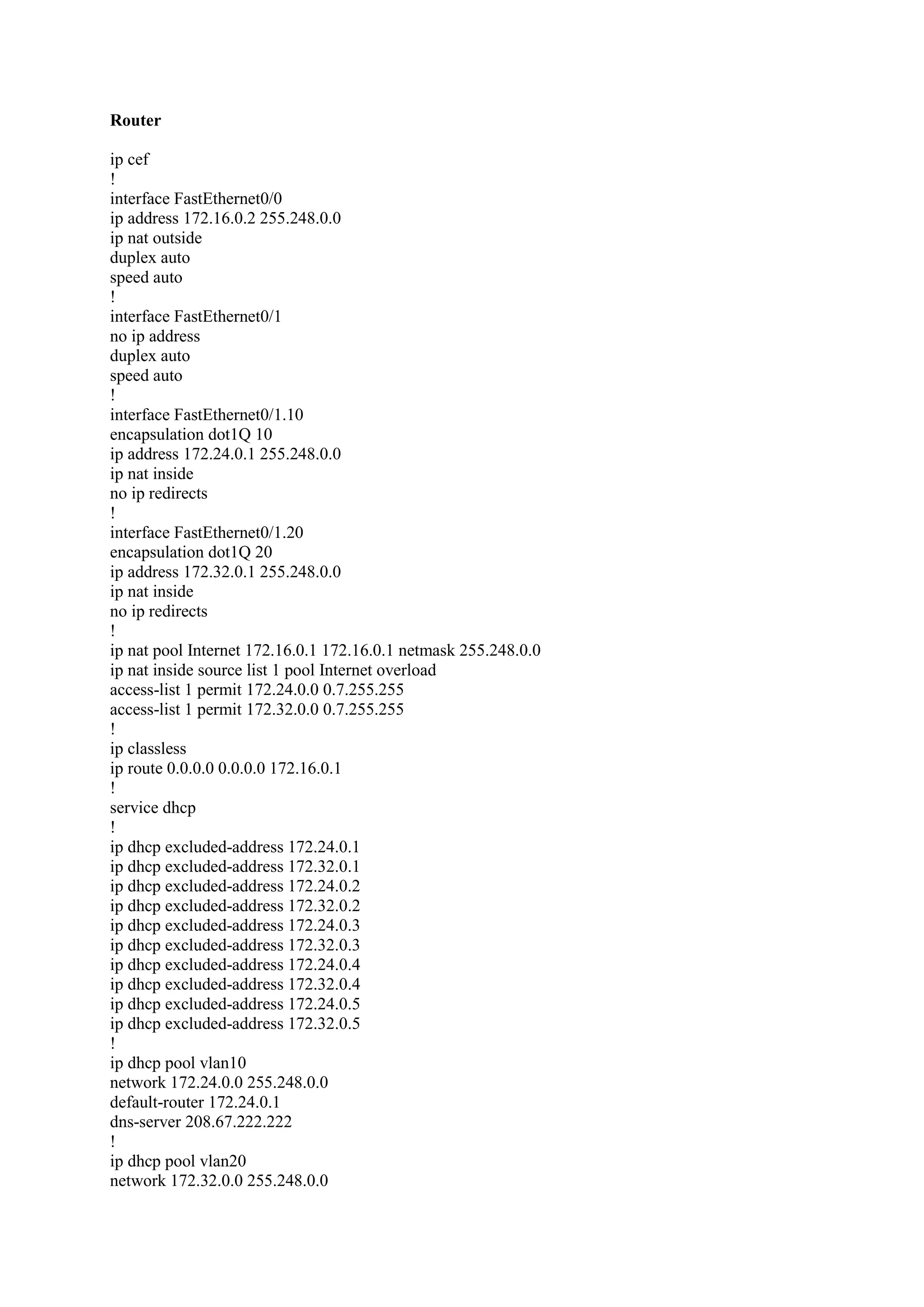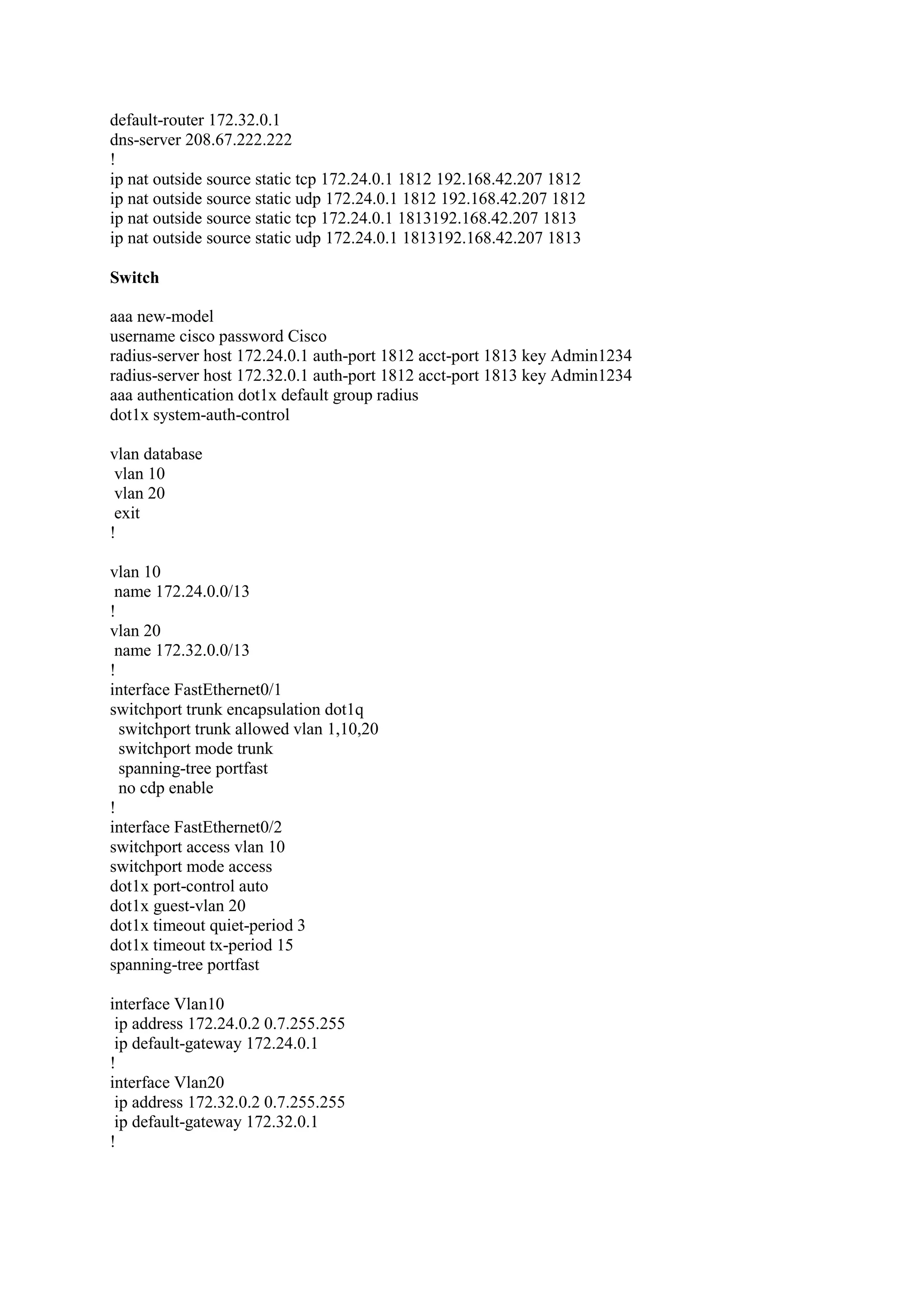 This document contains configurations for a router and switch to provide network access and authentication services for VLANs 10 and 20. The router is configured for NAT and DHCP services to translate private IP addresses to a public IP for internet access. The switch authenticates users on each VLAN via RADIUS and places unauthenticated users on the guest VLAN.