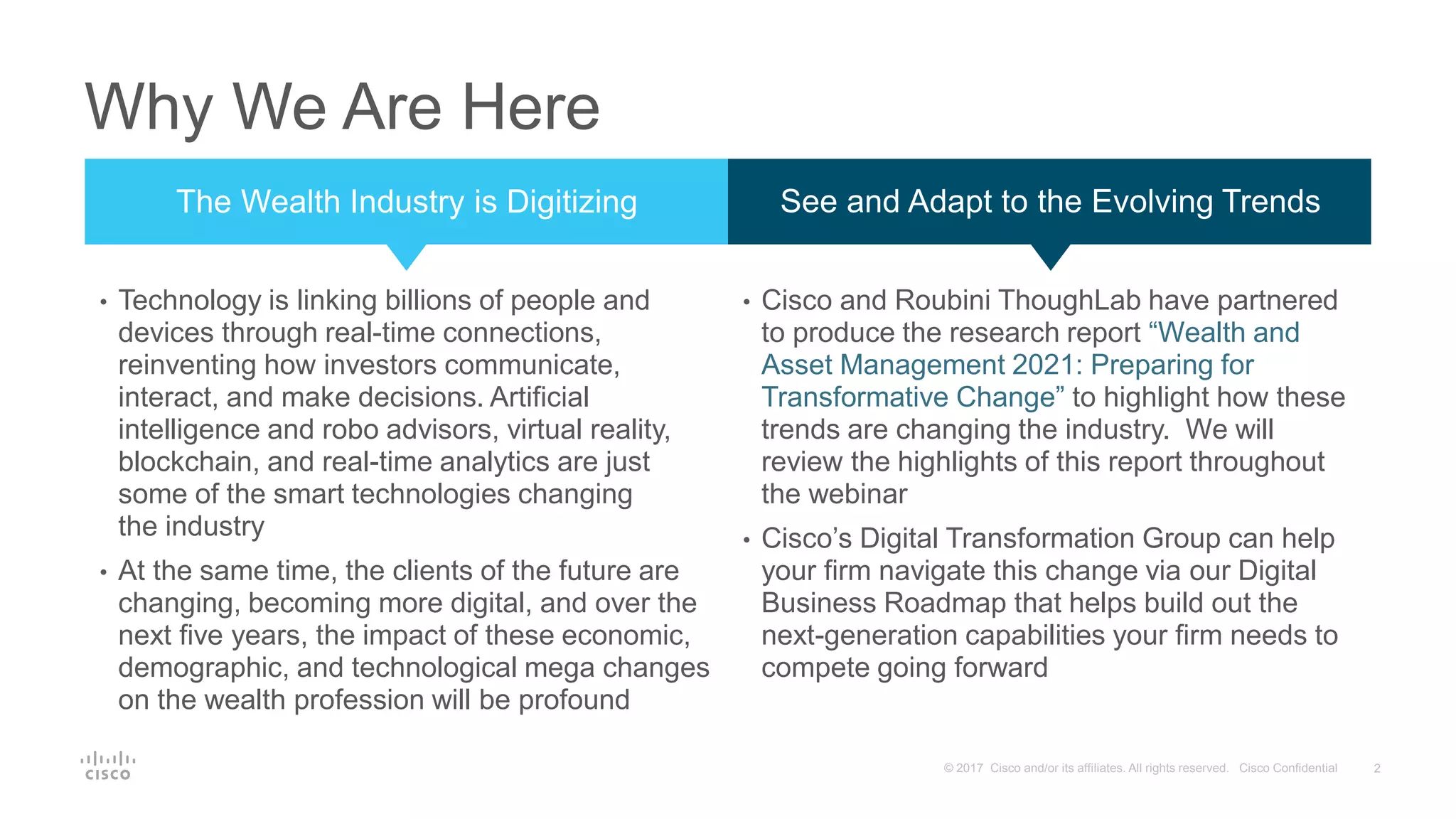 The document discusses a webinar presented by Cisco and Roubini ThoughtLab on defining digital transformation in the financial services industry. It highlights findings from their research report "Wealth and Asset Management 2021: Preparing for Transformative Change" which predicts that 48% of investors may switch providers by 2021 as the industry grows by $50 trillion and digital technology plays a larger role. The webinar aimed to help financial firms understand needed changes and capabilities to compete in the evolving digital landscape.