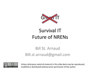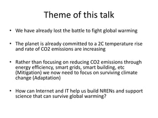 The document discusses how climate change poses an existential threat and that mitigation efforts alone will not be enough to address the problem. It argues that internet and information technology will need to help societies adapt to the unavoidable impacts of climate change through the development of renewable energy powered networks and applications that can survive increasing droughts, floods and other disruptions. Specifically, it envisions national research and education networks being built to follow available wind and solar power through technologies like cloud computing in order to maintain critical services as traditional energy infrastructure is compromised by climate change.