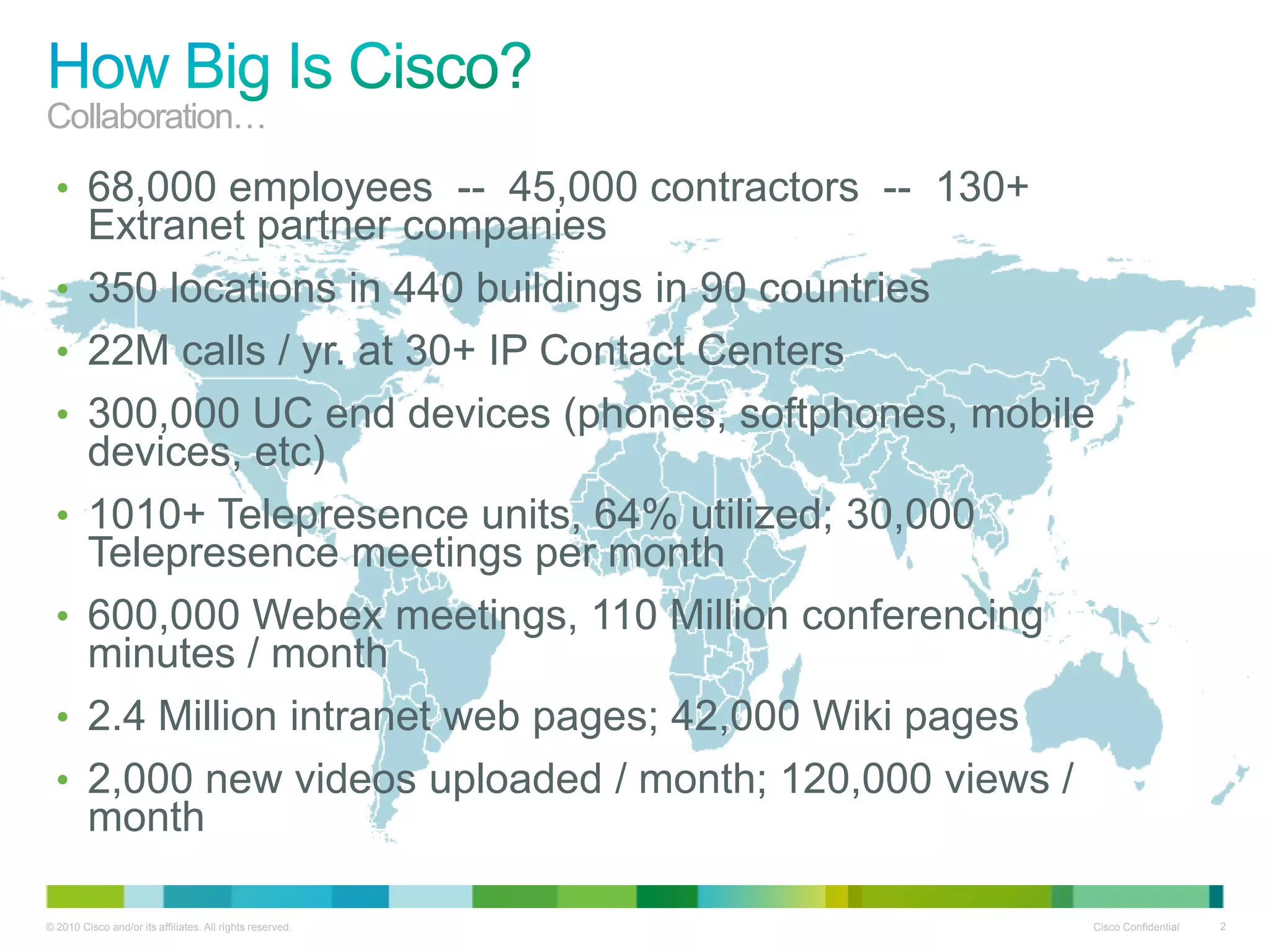 The document discusses Cisco's large global collaboration infrastructure, which includes over 68,000 employees, 300 locations across 90 countries, 300,000 UC devices, over 1,000 telepresence units, 600,000 Webex meetings per month, and 2.4 million intranet pages. It also summarizes trends driving increased collaboration like employee mobility, real-time video, and social software adoption. Finally, it provides examples of Cisco's own collaboration usage and successes in large-scale video conferences and migrations to new unified communication platforms.