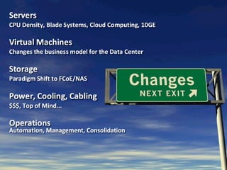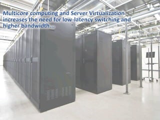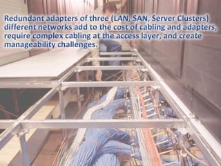 The document provides an overview of Cisco's Nexus data center portfolio, focusing on solutions such as the Nexus 5000 and Nexus 1000V, which facilitate low-cost 10GE connectivity and improved virtual machine management. It discusses the benefits of Fibre Channel over Ethernet (FCoE) and the Cisco Unified Computing System, emphasizing reduced total cost of ownership and enhanced operational efficiencies in data center management. Key features include automated provisioning, unified management, and improved performance capabilities with advanced processor technology.