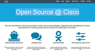 This document discusses Cisco's involvement with and support for open source technologies. Some key points: